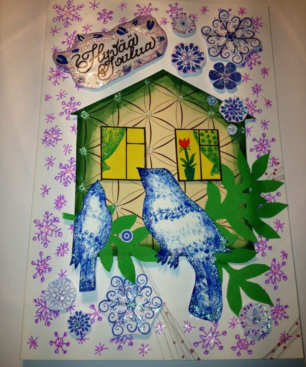 Materiaalina käytin eri värisiä papereita, paperiliima, kartonkia, glitterliima ja kaksipuolinen teippi.