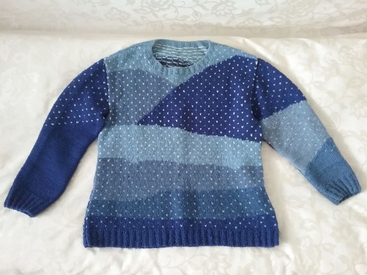 Sain tämän lämpimän villapaidan ystävältäni Turusta vuonna 2009 postin välityksellä työpaikalleni juuri samana päivänä, jolloin tarjosin siellä lähtokahveja eläkkeelle siirtymiseni johdosta. Ystäväni on suunnitellut mallin joensuulaisen/pyhäselkäläisen taiteilija Saara Tikan työn perusteella ja neulonut sen itse. Paita on lämmittänyt tänäkin talvena kovilla pakkasilla.