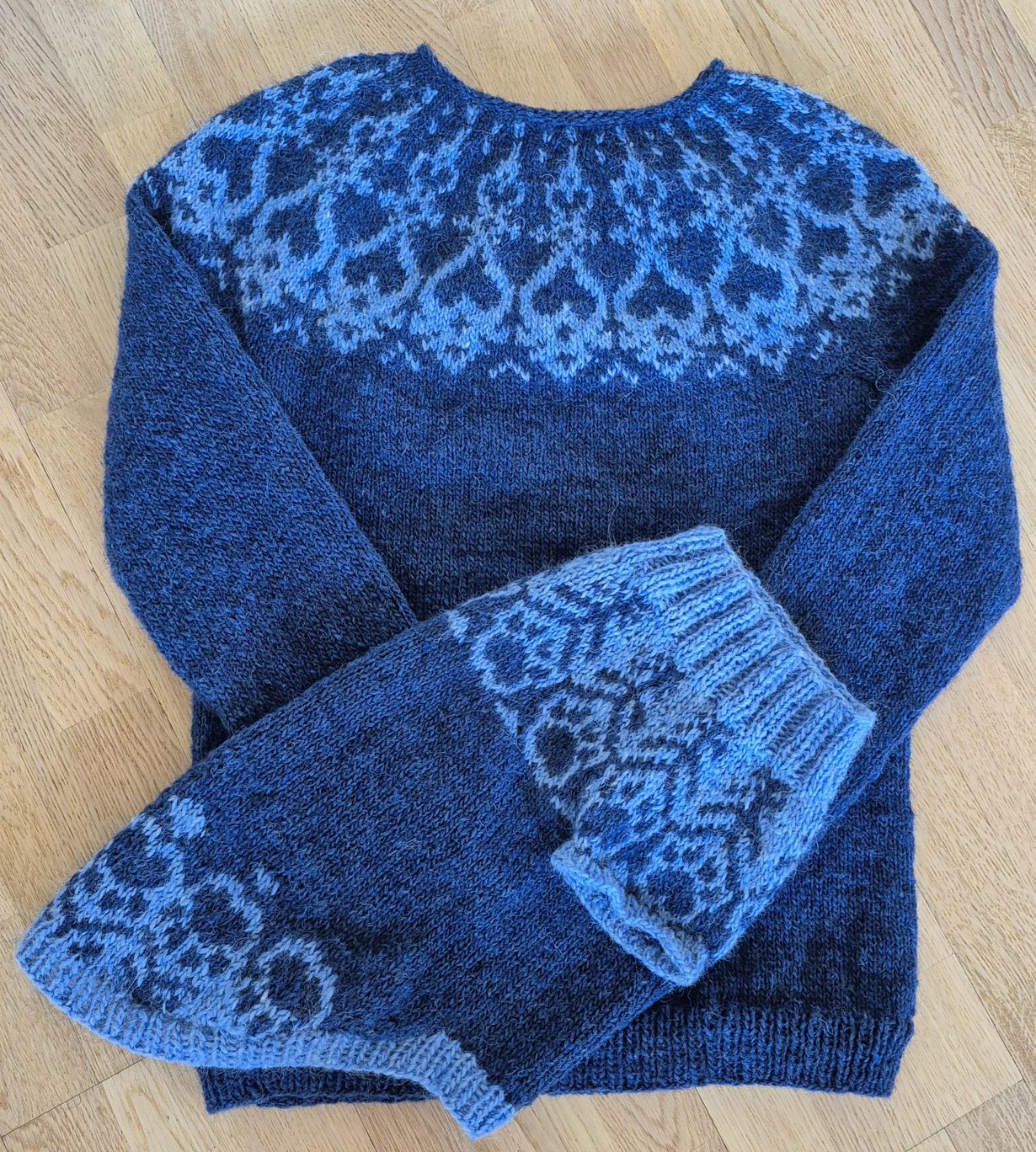 Poikani pyysi minua tekemään koiralleen villapaidan tulevaa Lapin vaellusta varten. Lankaa jäi yli ja näin kuvan Strömsö-paidasta. Niin syntyi idea sävy sävyyn paidoista koiralle ja isännälle.
