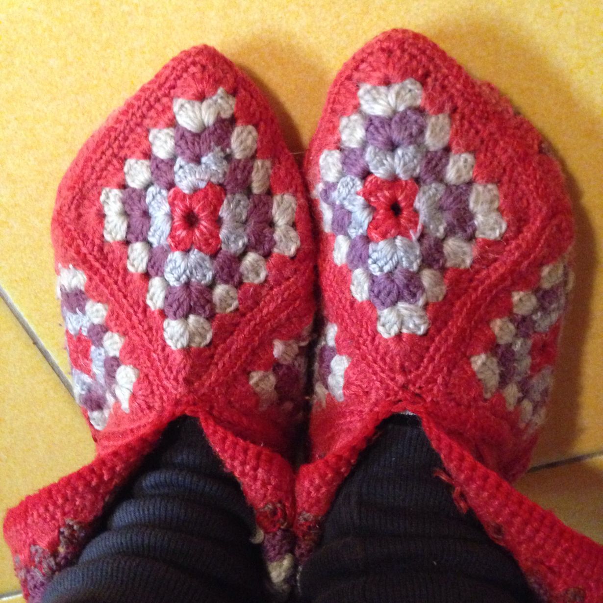 Anopin virkkaamat ihanat, värikkäät ja lämpimät tossut, joissa parasta on lötkötellä sohvalla.