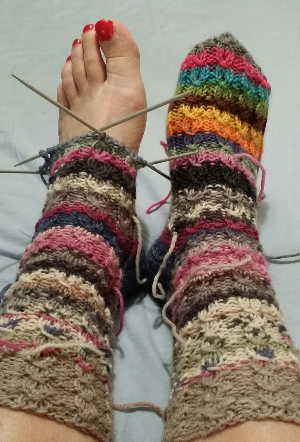 Olen kutonut villasukkia rakkaille läheisilleni ja ystävilleni. Sukkapareista on jäänyt langan jämua, joten päätin neuloa itselleni sukat. Niin syntyi veikeät raitasukat kuin räsymatto, muistona neulomistani sukista ?