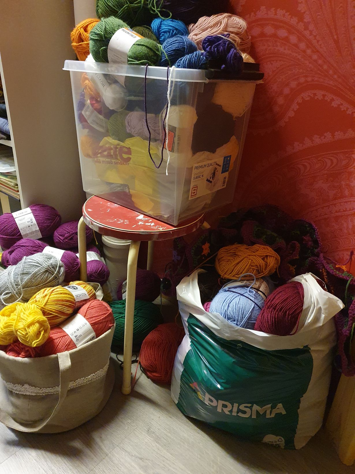 Mutta... joka projektiin tulee ostettua uusia lankoja enempi kuin vanhoja kuluu. Ja tässäpä ne mitkä ei mahdu langoille varattuun isoon laatikkoon.