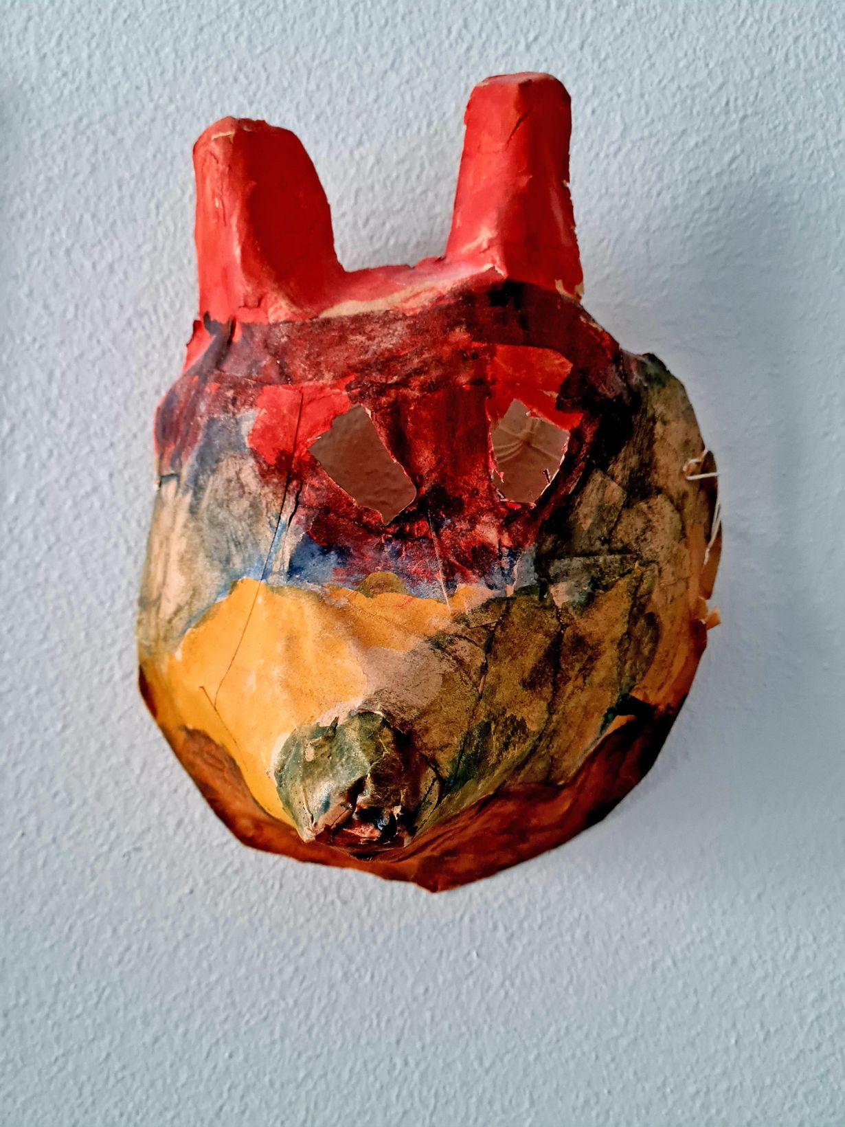 Aleksi teki kettunaamarin joskus alaluokilla. Se tuotiin sitten keväällä kotiin. Siitä asti se on ilahduttanut minua seinällä. Paikkakin on vaihtunut muutaman kerran. Hymy nousee kasvoille kun katson sitä. Rakas ilo.