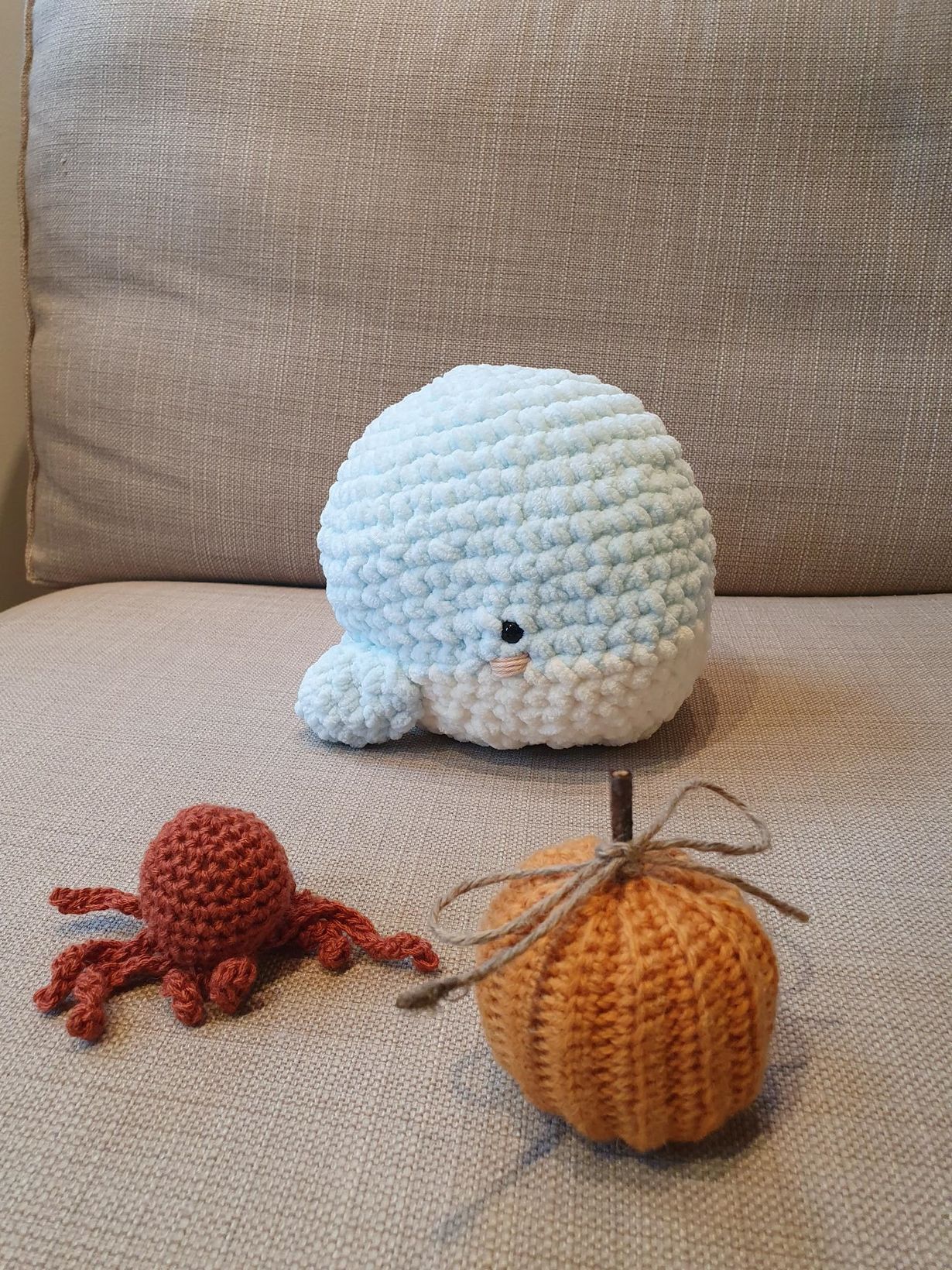 Lapseni virkkuukoukuilla syntyy mitä ihanimpia pehmohahmoja. Kesälomareissun jälkeen syntyi sininen valas ja nyt viimeisimpänä ajankohtainen kurpitsa. Mustekaloja on koko lauma.