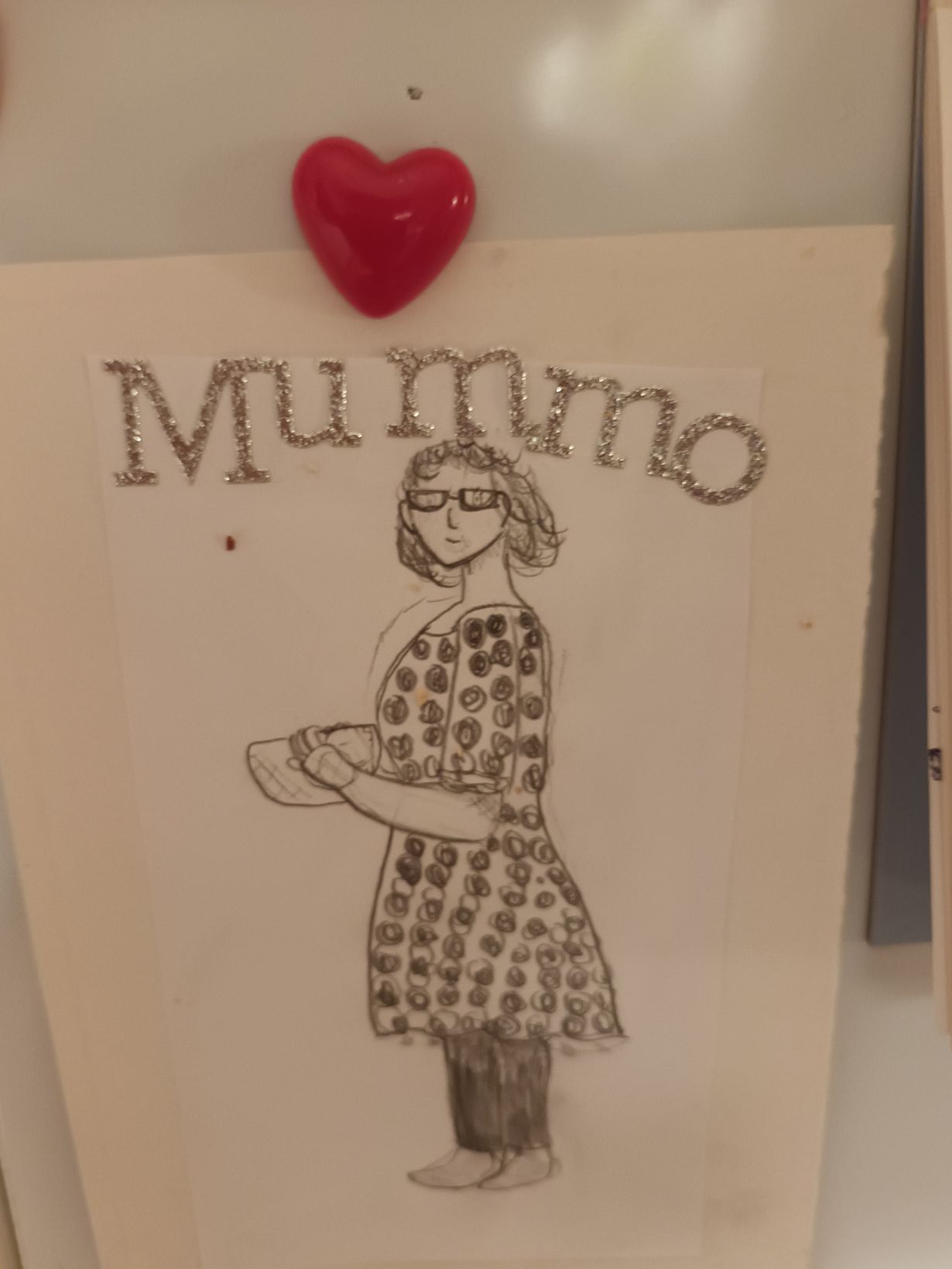 Leivoin pienen lapsenlapseni kanssa. Taikinaa piti kovasti vatkata joten tein sen osuuden. Sillä aikaa tyttö piirteli keittiön pöydän ääressä. Ja hyvin piirtelikin, siinä mummo vatkaa taikinaa ja on vaatteita myöten tunnistettavissa.