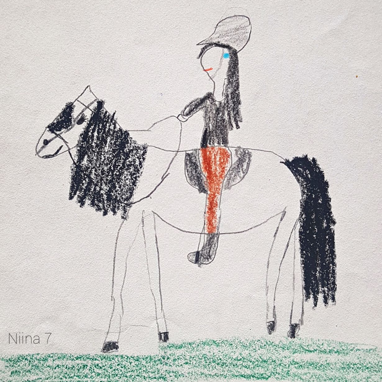 Kuvan, ratsastajasta hevosen selässä, piirsi tyttäremme 7-vuotiaana. Hänellä oli tällä viikolla syntymäpäivä. (Coronatartuntariskin vuoksi emme voineet mennä synttäreille.) Tein syntymäpäiväkortin johon lisäsin tämän vuosikymmenten takaisen piirustuksen.