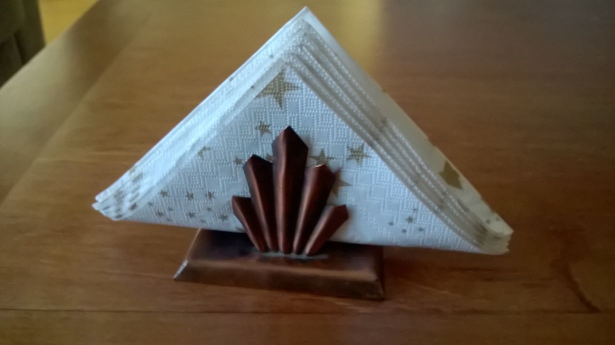 Kuvan serviettitelineen on tehnyt poikamme 90-luvun alussa metallityötunnilla ollessaan Hyrylän koulukeskuksen yläasteella. Teline on aina sopinut sisustuksiimme vuosien varrella, eikä ole tullut mieleen uusia sitä.