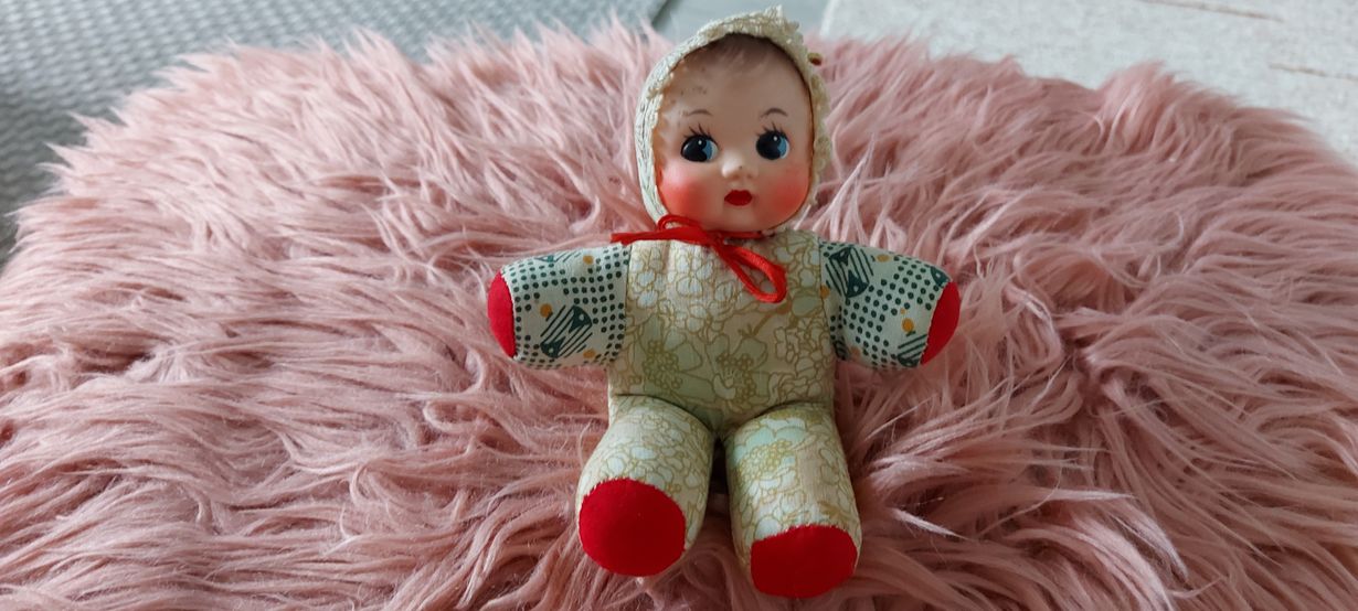Sain nuken Kuopion tammimarkkinoilta ehkä 1960-luvun lopulla tai 1970-luvun alussa.Nukke on kankainen ja kun painaa keskeltä,nukke vinkaisee.Nukke on kulkenut mukanani lapsuudenkodistani useampaan eri koteihin.En muista,olenko antanut nukelle nimeä.Mielestäni olen mieltynyt pienestä pitäen väreihin.