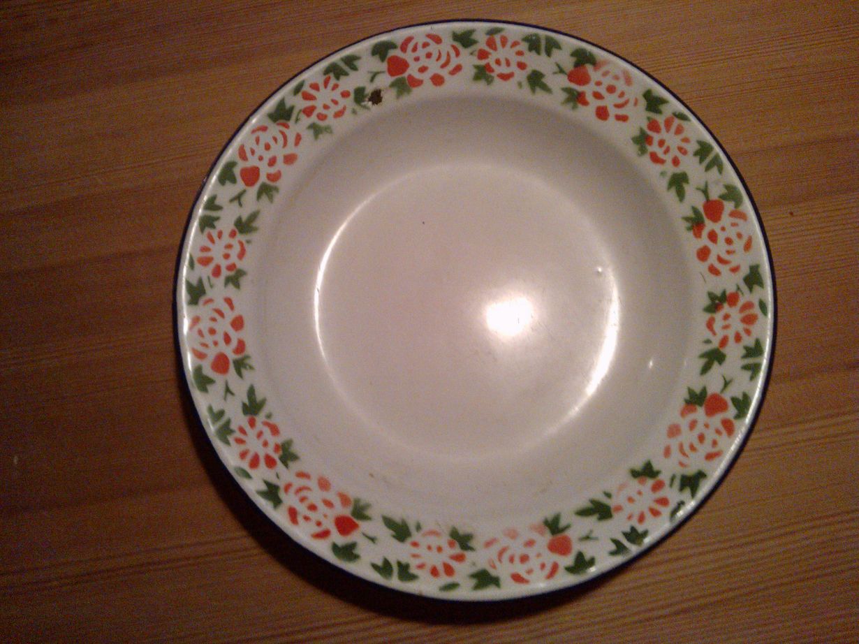Äitini toi joskus kauan sitten markkinoilta minulle ja siskolleni emalilautaset. Lautaseni on tässä , se on kulkenut mukanani ja ollut käytössä myös lapsenlapsillani . Nyt se koristaa keittiössä hyllystöä jossa on muitakin vanhoja emaliastioita.