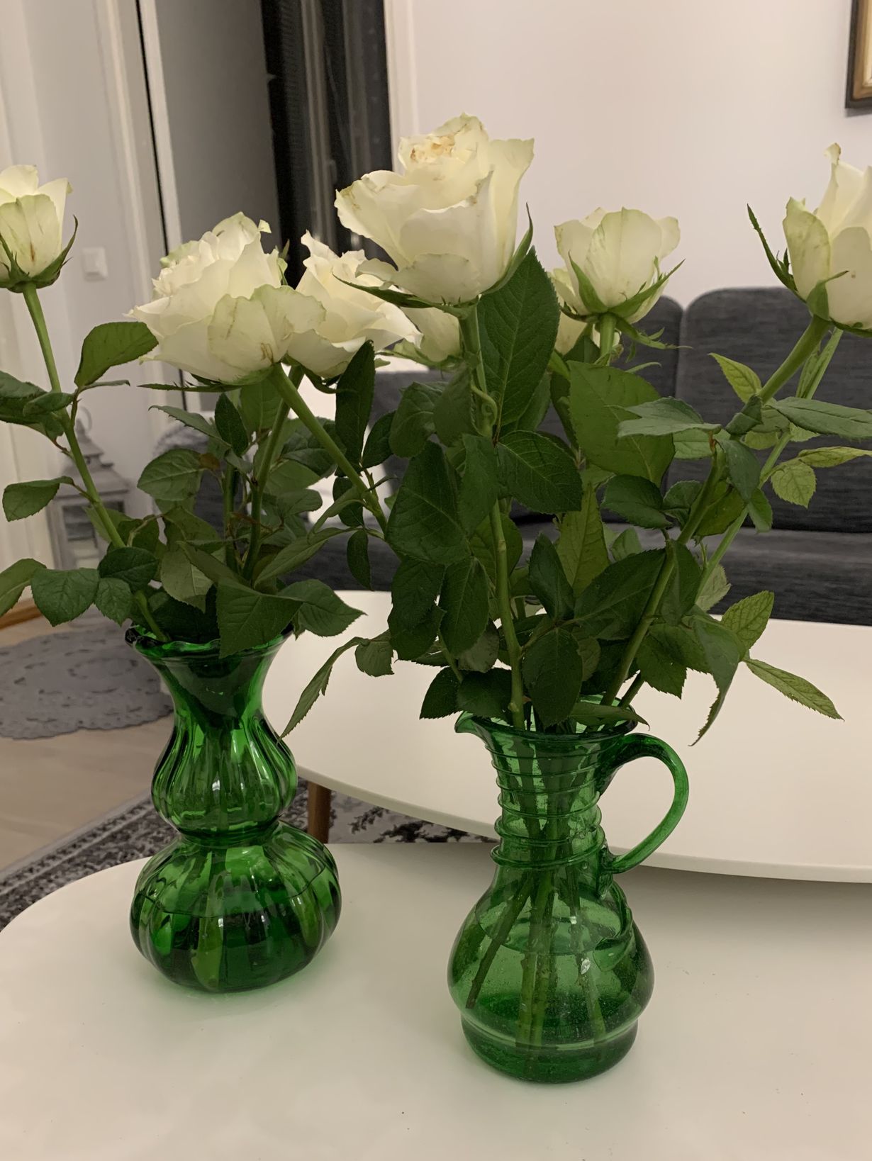 Nämä maljakot olen aikoinaan saanut äidiltäni omaan kotiini. Hänellä oli tapana keräillä erilaisia astioita/esineitä ja nämä vihreät lasimaljakot ovat ajalta jolloin hän keräili erilaisia lasiastioita tms.