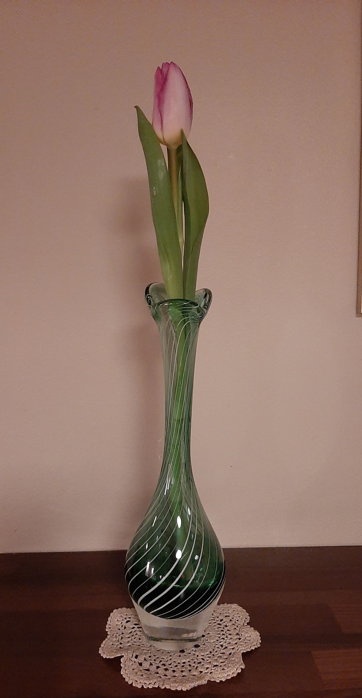 Muisto lapsuuskodista. Maljakko, jonka siroa muotoa ja kaunista lasin kuviota ihailin jo lapsena. Valmistajaa enkä suunnittelijaa en tiedä, vaikka olen yrittänyt selvittää.