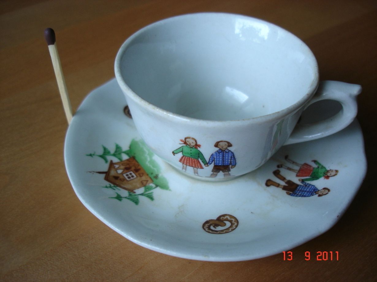 Olen saanut tämän kuppiparin lapsena (joskus 50-luvulla) ja jo silloin se oli hyvin rakas minulle. En varmaankaan juonut siitä kahvia, mutta leikeissä se oli mukana. Nyt se on vitriinissä näkyvällä paikalla. Kuppipari on pieni, siksi siinä on tulitikku ikäänkuin mittatikkuna.