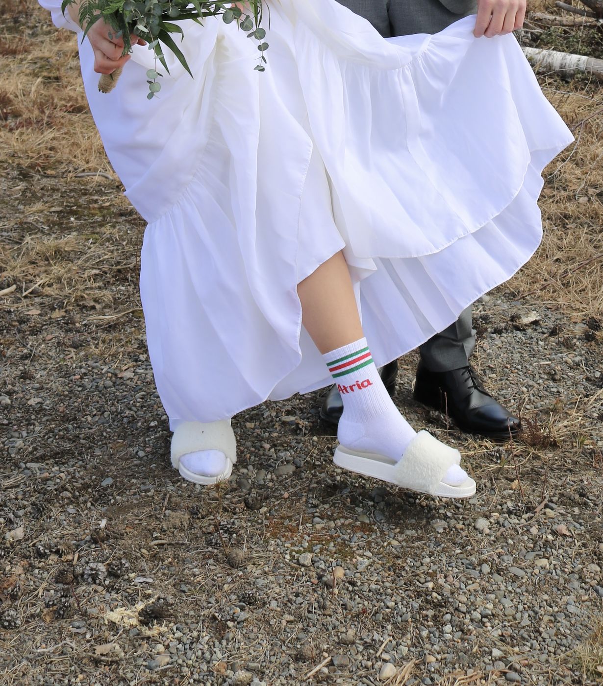 Hääkuvauksiin piti keksiä kengät, jotka saa likaantua, mutta ei erotu helman alta. Kengiksi valikoitui pörröiset läpsykkäät (ja Atrian sukat). Nykyään läpsykkäät toimii pihakenkinä.