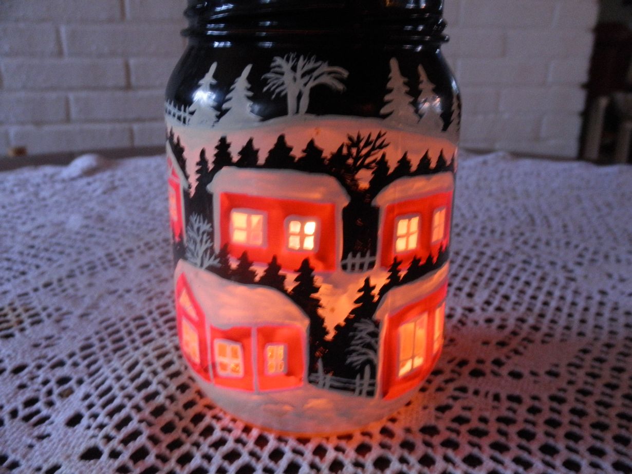 Kirpputorilöytö Oulun Hiukkavaaralta. 14 cm:n korkuiseen lasipurkkiin oli maalattu talvinen maisema punaisine taloineen. Tuikku tai led-tuikku purkin sisällä palamassa on hyvin tunnelmallinen joulukoriste.