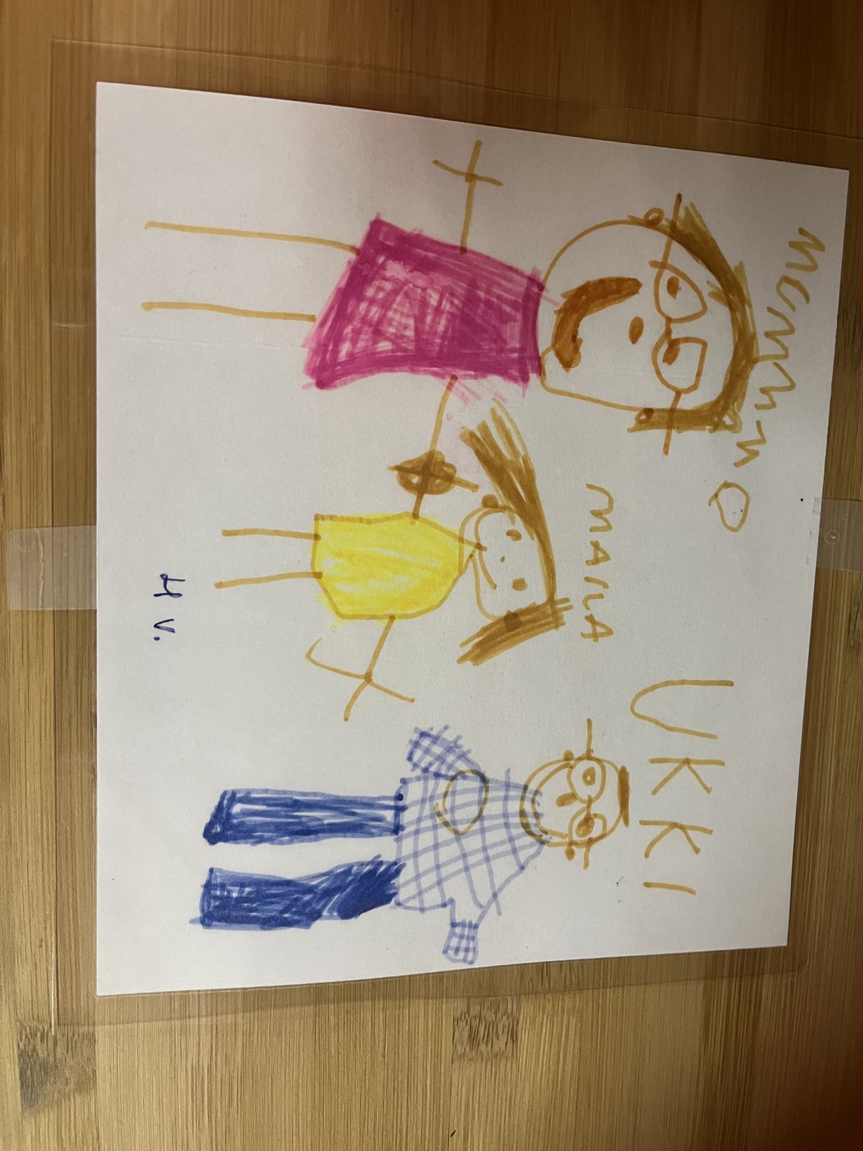 Lähetä kuvakisaan kuva lapsen piirroksesta, jonka olet säästänyt - voita Familonin pussilakanat! Lasten piirrokset Ritva 18.2.2025 klo 11:54 Lapsenlapsi oli käymässä mökillä ja teki piirustuksen. Tämä on edelleen jääkaapin ovessa.