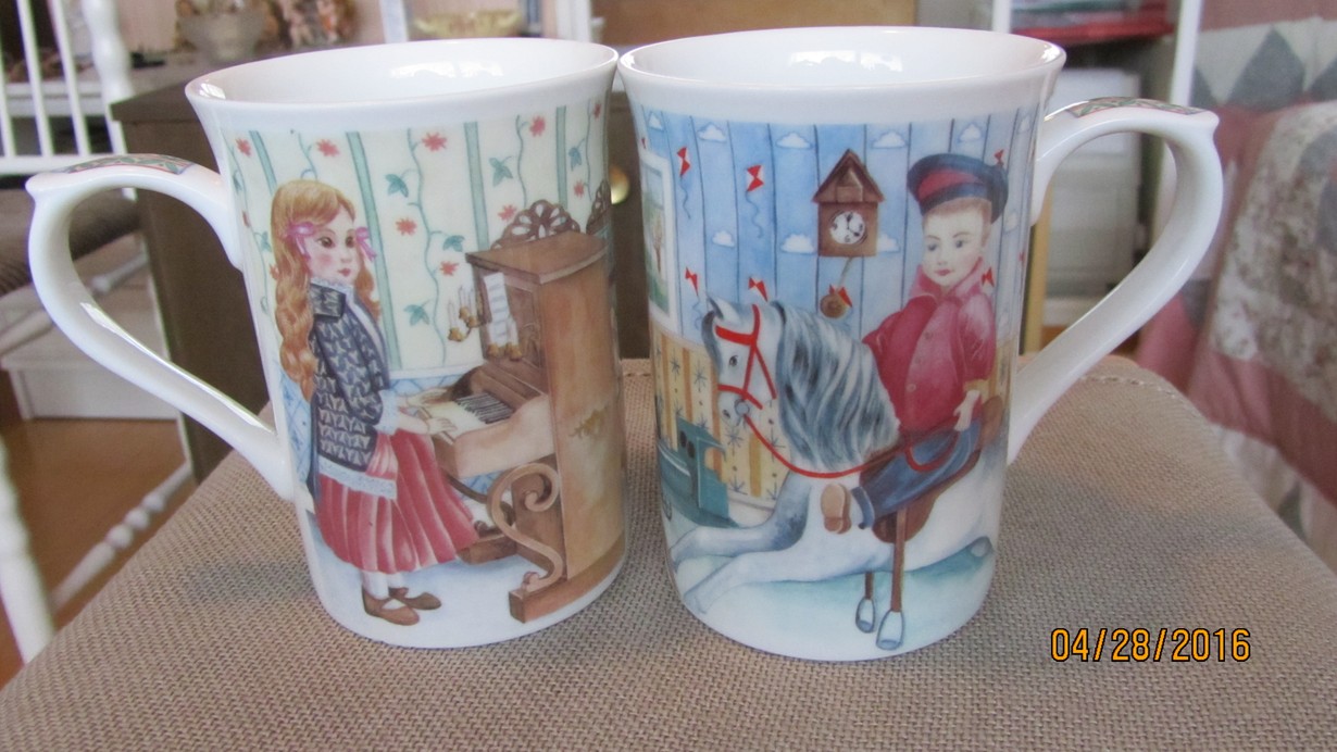 Näitä englantilaisia mukeja on jäljellä kaksi paria kummallakin kuviolla. Ovat varsinkin suvun pikku tyttöjen mieleen. Alle kouluikäisten käyttöön en niitä juuri