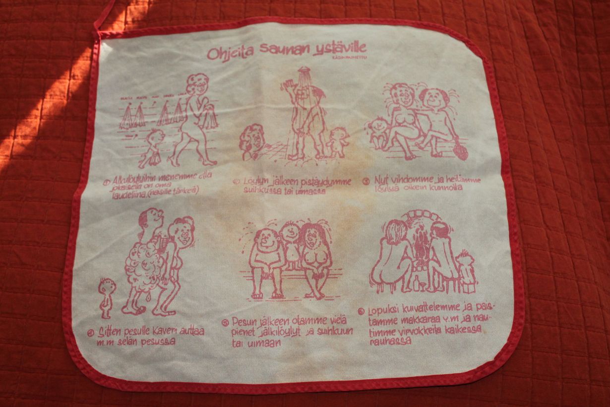 Häälahjaksi vuonna 1990 saatu laudeliina on käytössä edelleen. Mieheni sininen samanlainen on sen sijaan jo hävinnyt. Olemme yrittäneet noudattaa laudeliinan ohjeita arkielämässä.