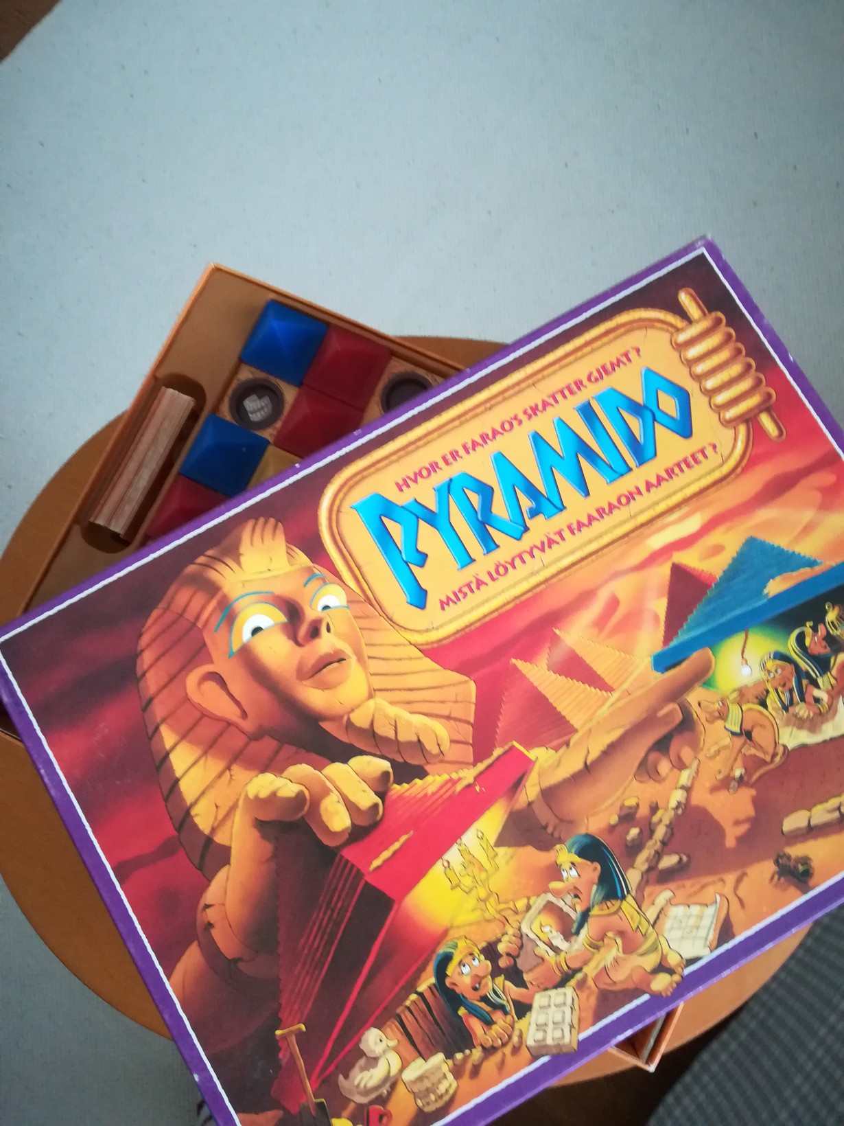 Tämä Pyramidi-peli oli ahkerassa käytössä meidän omilla lapsillamme jo 80-luvulta lähtien. Opetin lapset aina huolehtimaan pelin osista, kun pelit oli pelattu. Niinpä voimme nyt pelata lastenlasten kanssa vieläkin tätä suosittua peliä.