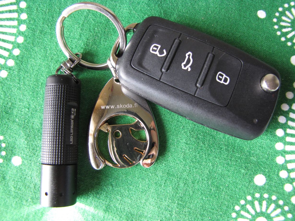 Skodan avaimenperäpoletin sain auton mukana. Led-valaisin on sopivan pieni ja kevyt, auto löytyy parkkipaikalta pimeässäkin.