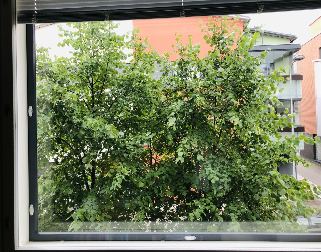 Kun muutin uuteen kotiini näköala oli vastakkaisen talon rapattu seinä. Nyt muutaman vuoden päästä saan ihailla tuuheita lehmuksia.