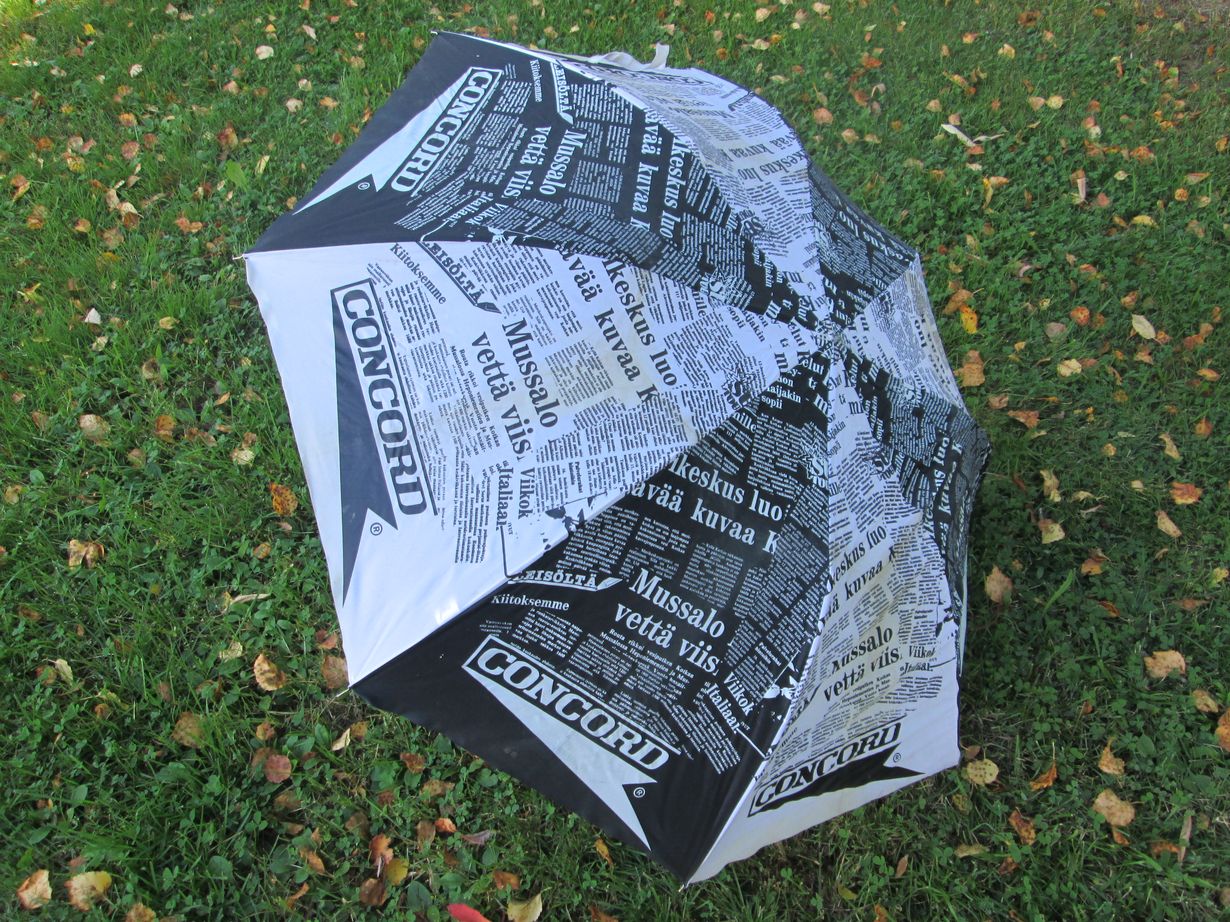 Sanomalehtisateenvarjo kulkee aina autossa mukana - koskaan ei voi tietää milloin tarvitsee. Sateenvarjon olen ostanut joskus muinoin, kuvio kuvasi hyvin silloista työtäni.