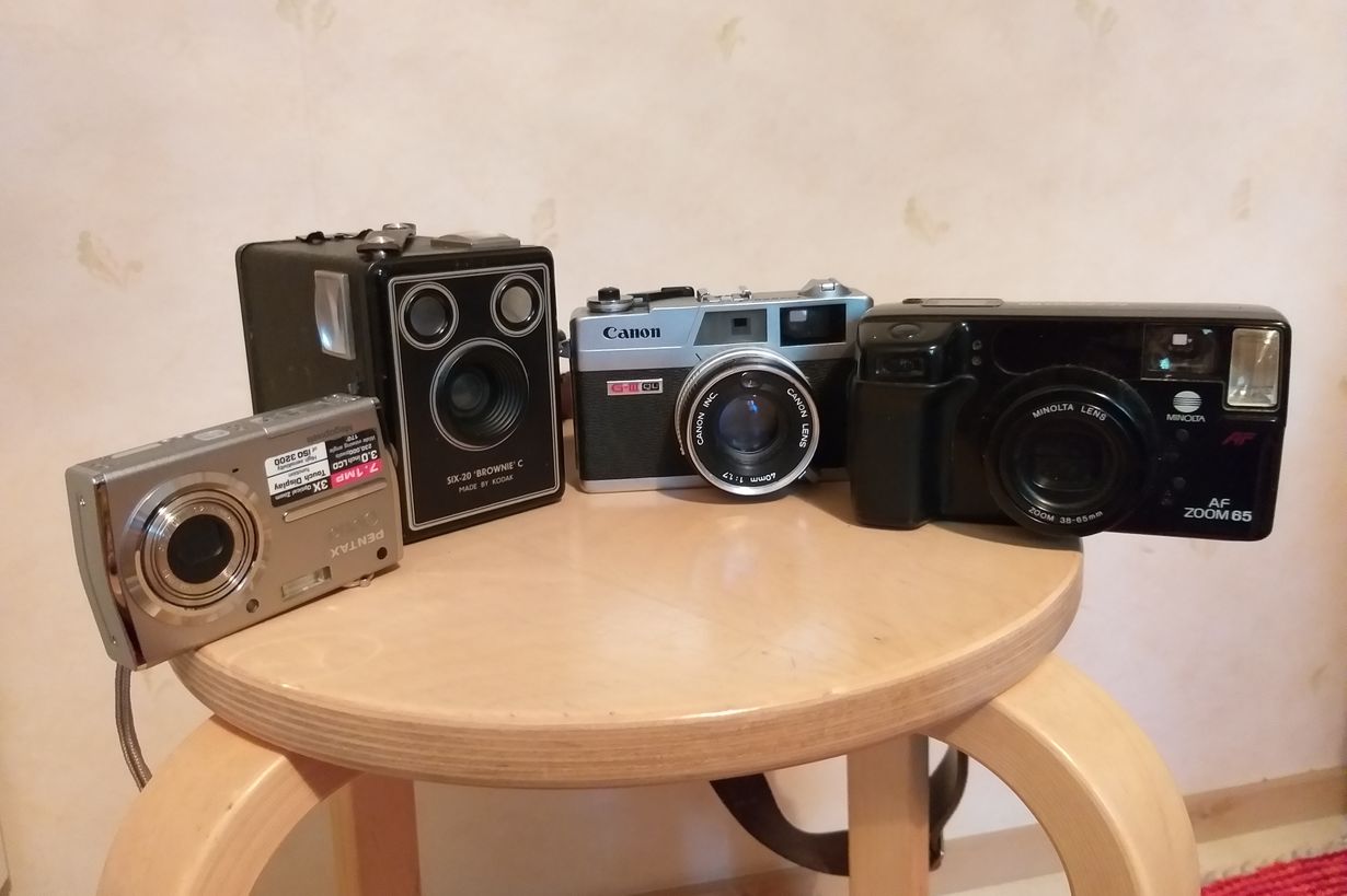 Kameroita yli kuuden vuosikymmenen ajalta. Kaikilla on aikanaan talletettu muistoja. Kaipa niistä joku vielä toimisikin, mutta puhelin on syrjäyttänyt kaikki hienot koneet.