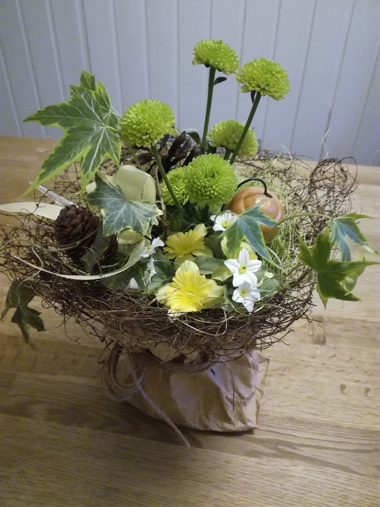 Sisalrenkaaseen olen upottanut kukkaputkia jotka täytän vedellä. Ostan muutaman leikkokukan, kukilla on omat vesipaikat. Väriä ja kukkia vaihtamalla helppo saada erinäköisiä helpolla ja halvalla.