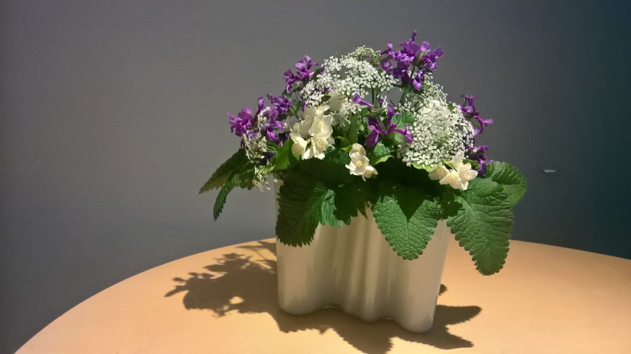 Sain ystävältäni aaltomaljakon josta hän ei itse pitänyt. Hänen mielestään siihen oli vaikea tehdä kukka-asetelmaa tai että niitä kukkia olisi pitänyt olla niin paljon. Otin tämän haasteena.... Sain häneltä kimpun jasmikkeita, joita täydensin mummon mökin pihastani poimimillani jalopähkämön kukilla ja lehdillä sekä koiranputkella. Lopputulos sai ihastelua häneltäkin ☺