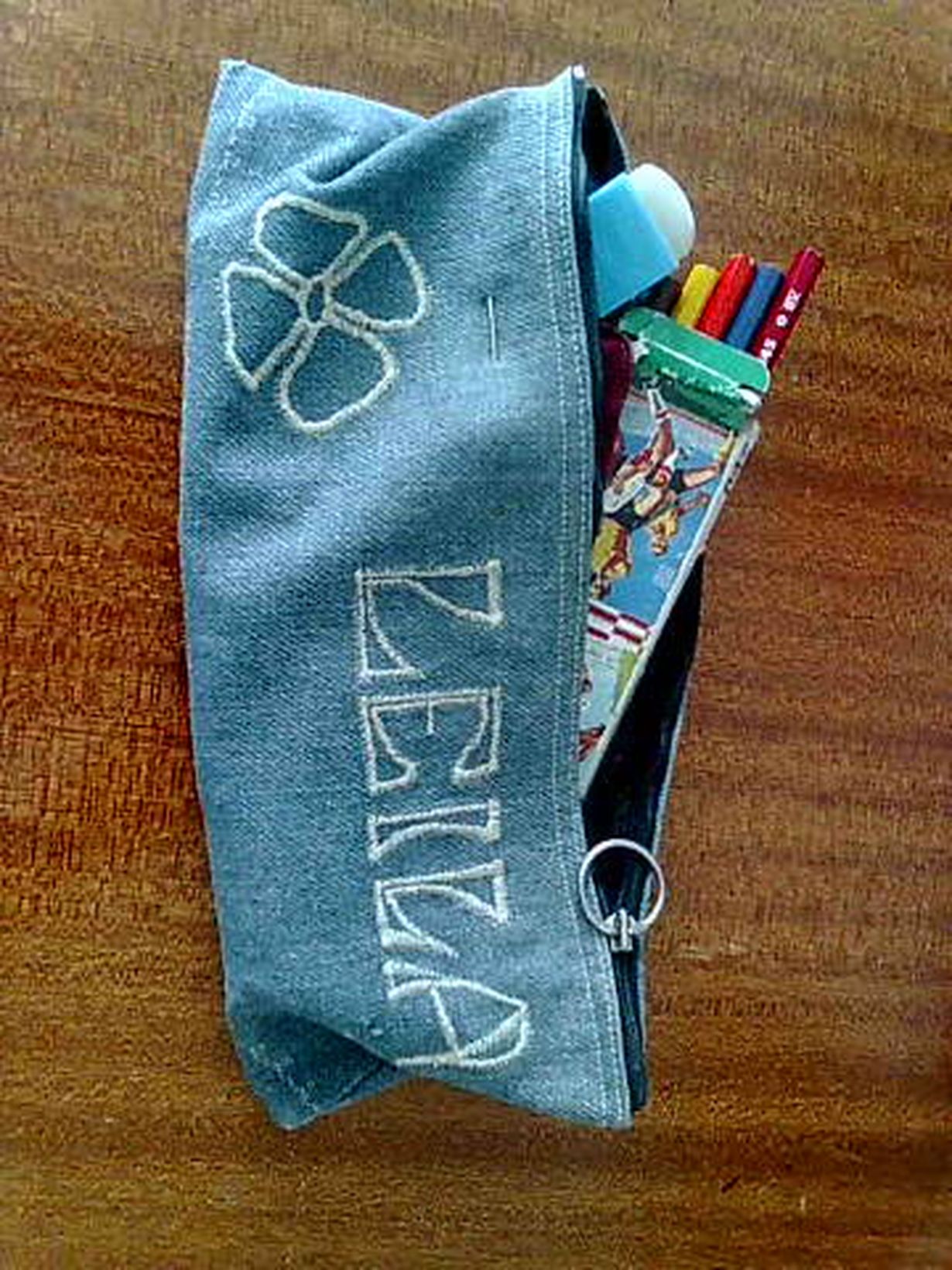 Ompelin ja kirjailin tämän penaalin vanhoista farkuistani 70-luvun puolivälissä. Olin ostanut silloin uuden Singer Futura ompelukoneen jossa oli hienoja koruompeleita ja kokeilin niitä tähän penaaliin.