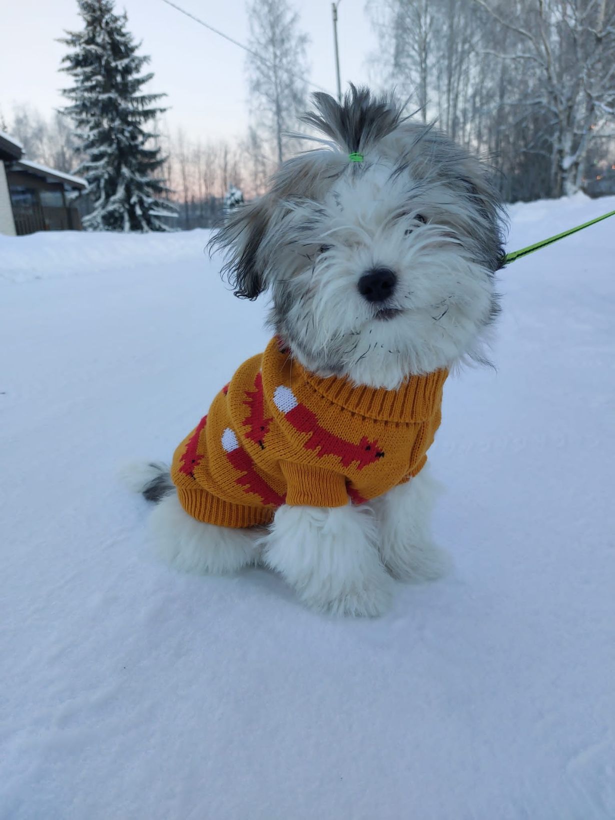 Neljän kuukauden ikäinen coton de tulear- pentu Tyyne ulkoili kirpeässä tammikuisessa pakkassäässä neulepaita yllään. Paita ei menoa haitannut!