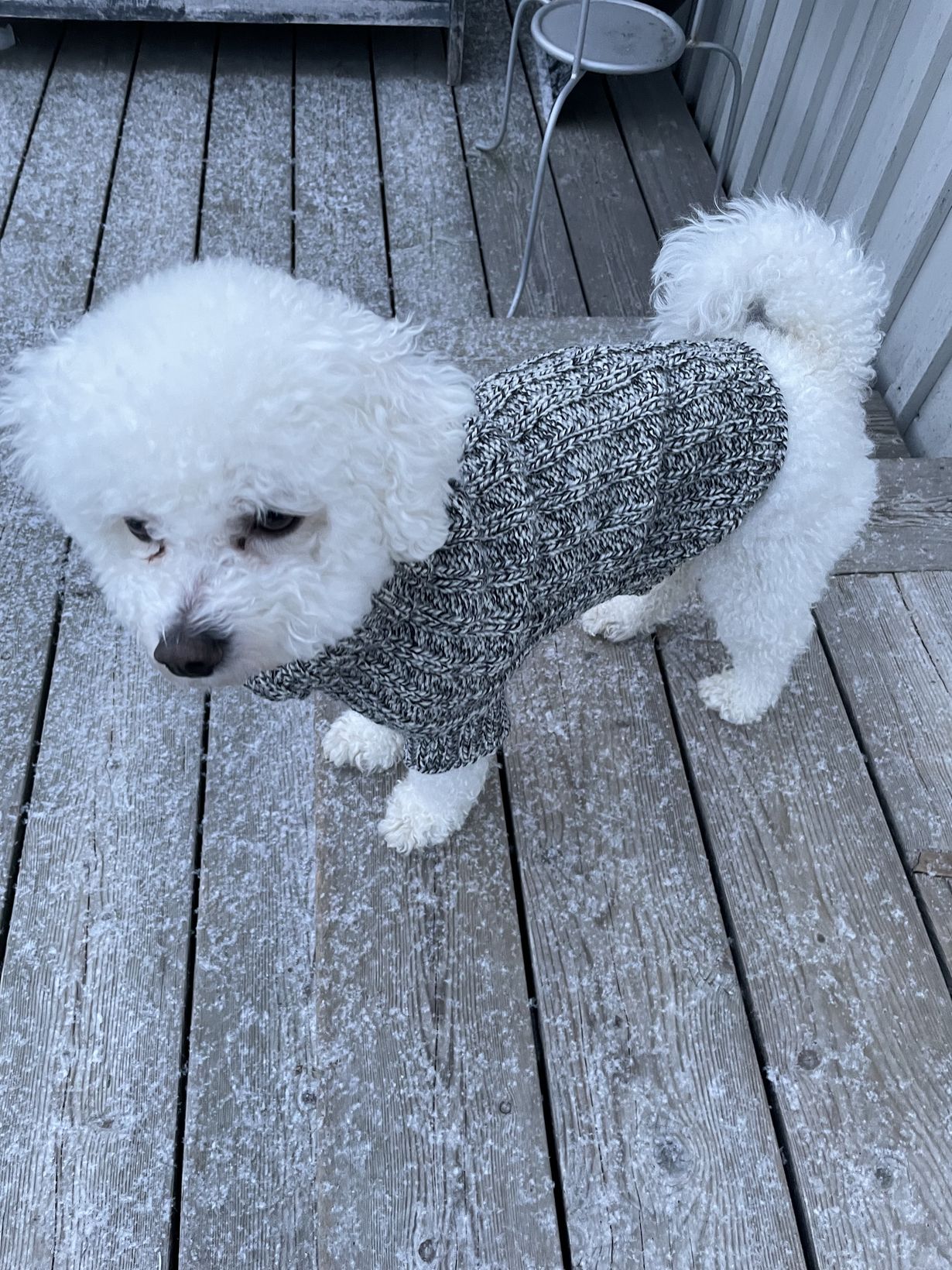 Lähetä kuvakisaan kuva lemmikkisi vaatteesta - voita Moomin Arabian aakkosmukeja! Lemmikin vaate Ropsu 6.2.2024 klo 19:18 Taitava ihana ystävä neuloi tämän nutun jottei meidän Roope palele pakkasilla.