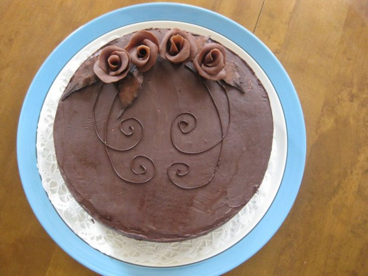 Leivoin itse kakut rippijuhliini ja tämä onnistui kaikkein parhaiten, sekä ulkonäön että maun kannalta. Kakku on melkein kuin sacher, mutta sen sisällä on vadelmatäyte. Kuorrutus ja lehdet ovat suklaata ja ruusut marsipaania. Tämä taitaa olla kautta aikojen lemppari kakkuni!