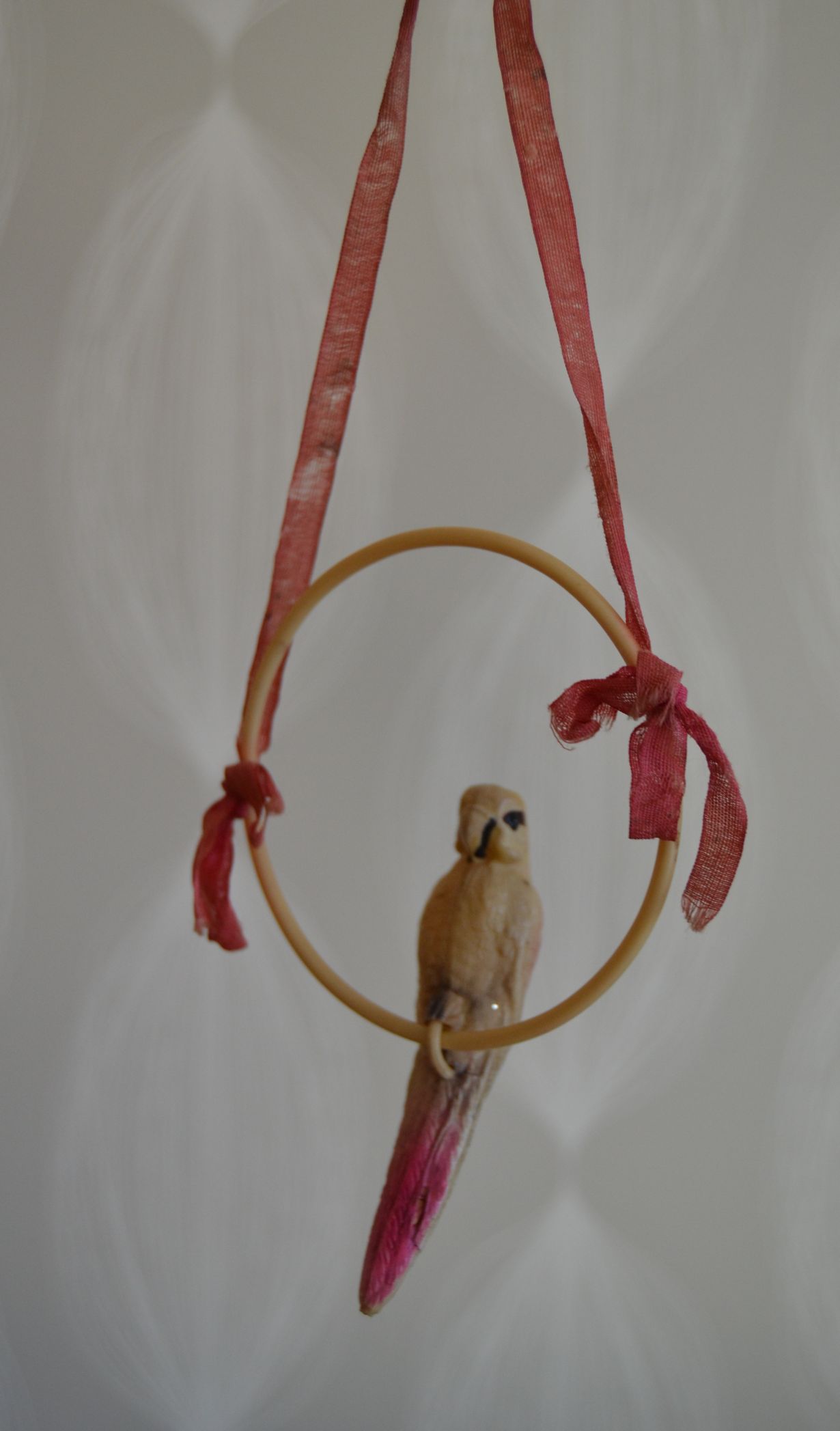 Papukaijakoriste ripustettiin aina lapsuuteni kodin joulukuuseen. Pikkusiskon kanssa nahisteltiin siitä kumpi sen sai tehdä. Koriste on -50 luvulta ja koristaa nyt oman kotini joulukuusta. Silkkinauhat ovat alkuperäiset kuten myös papukaijan koristemaalaus.