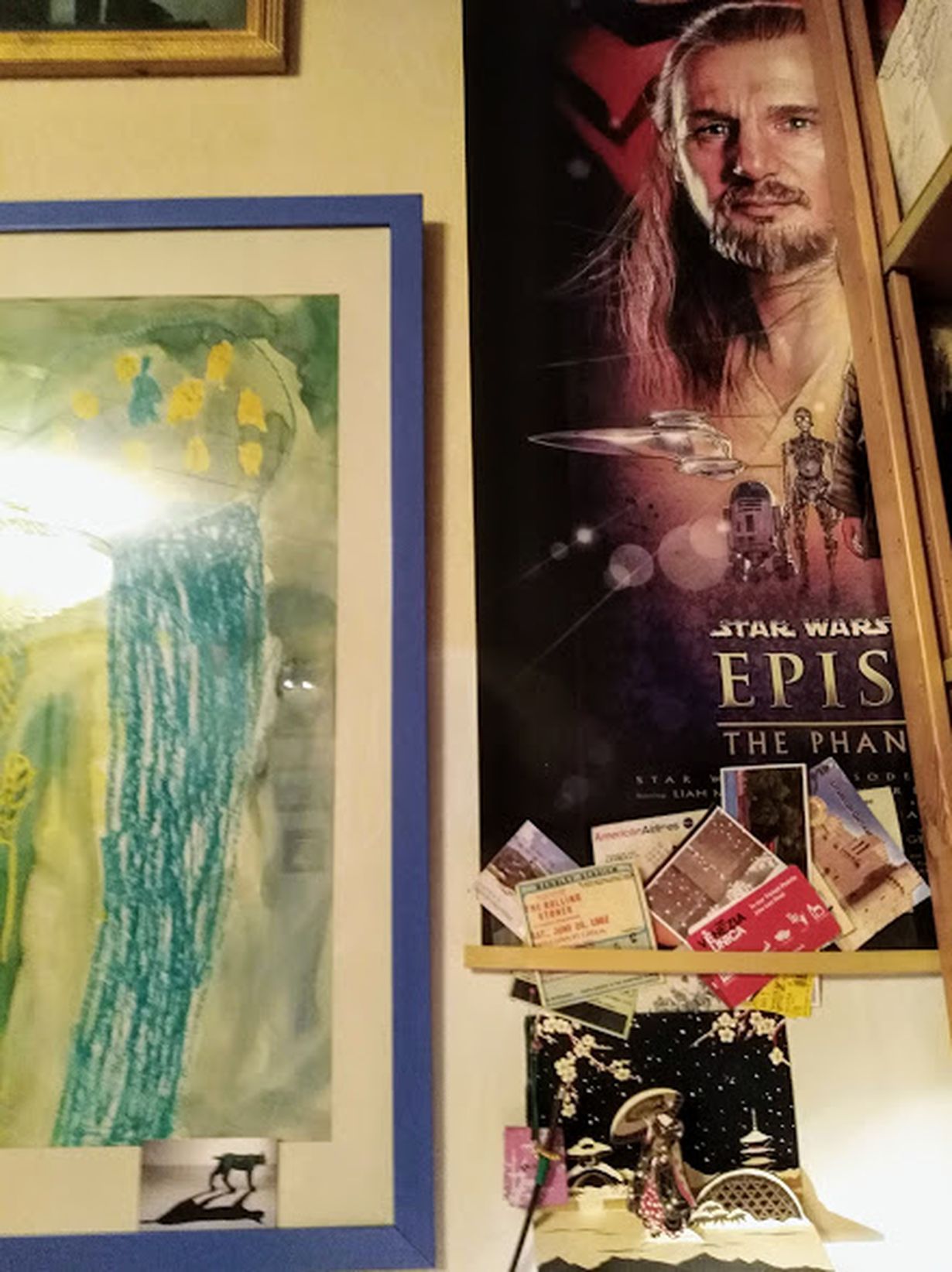 Odotettua Star Wars Episode One – Phantom Menace-elokuvaa katsoimme poikiemme (vm. -87 ja – 89) kanssa aikanaan ainakin tuhat kertaa ja tottakai julistekin piti hankkia. Kirjahylly vaati aikanaan tilansa, mutta juliste jäi kurkistelemaan sen takaa. Sen pidikkeeseen on vuosien varrella kertynyt pääsylippuja eri kohteista, mm. vaimon lippu Rolling Stonesin konserttiin Wembley Stadiumilla v. 1982.