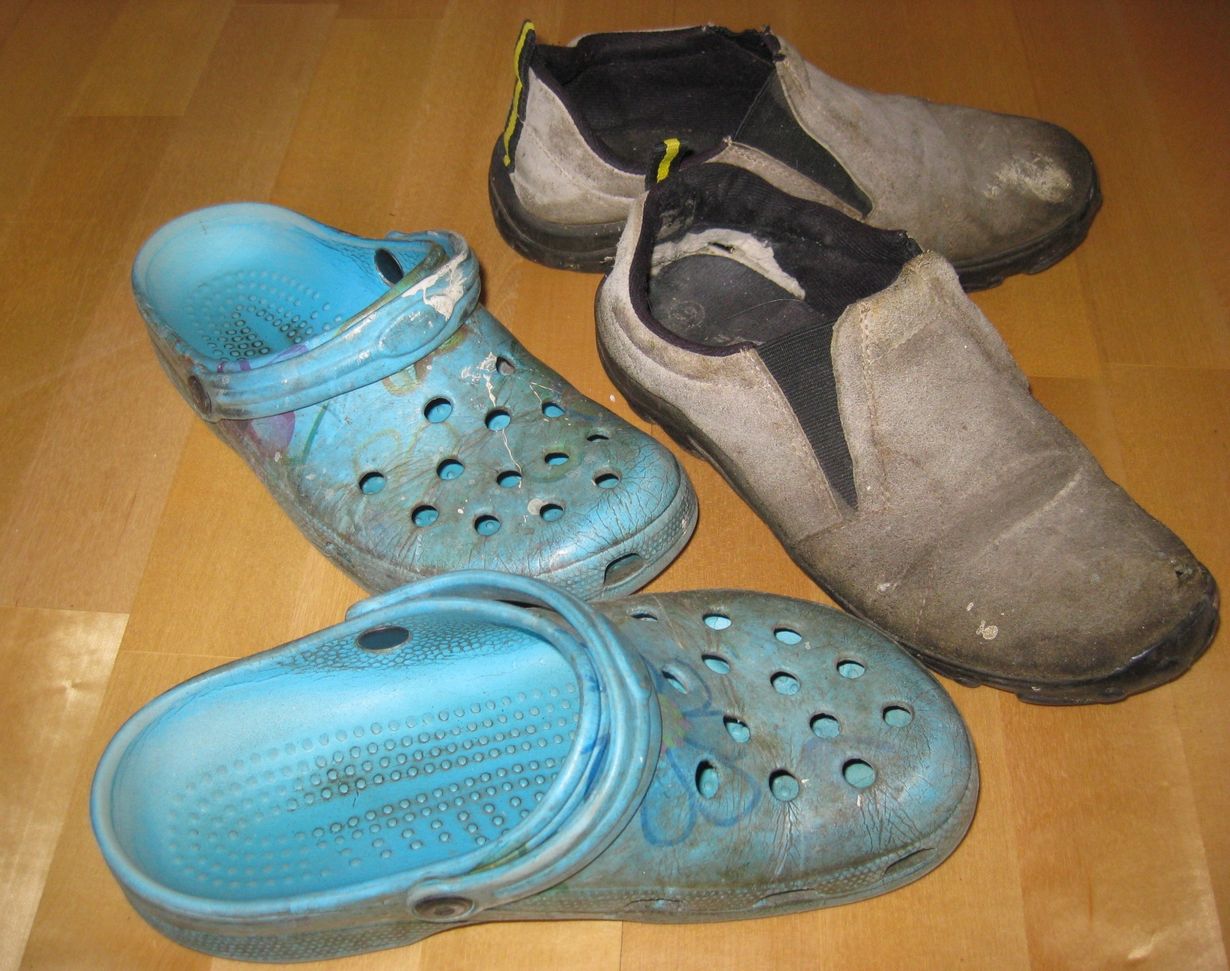 Arkikesäkengät! Crocsit käyttäjän jalkaan sopivat, aina ovensuussa käyttäjää odottamassa jos ei jossakin menossa. Sitten nuo toiset, mitä mainioimmat nurmikon ajukengät, eivät kelpaa muuhun käyttöön. Kuva puhukoon puolestaan!!