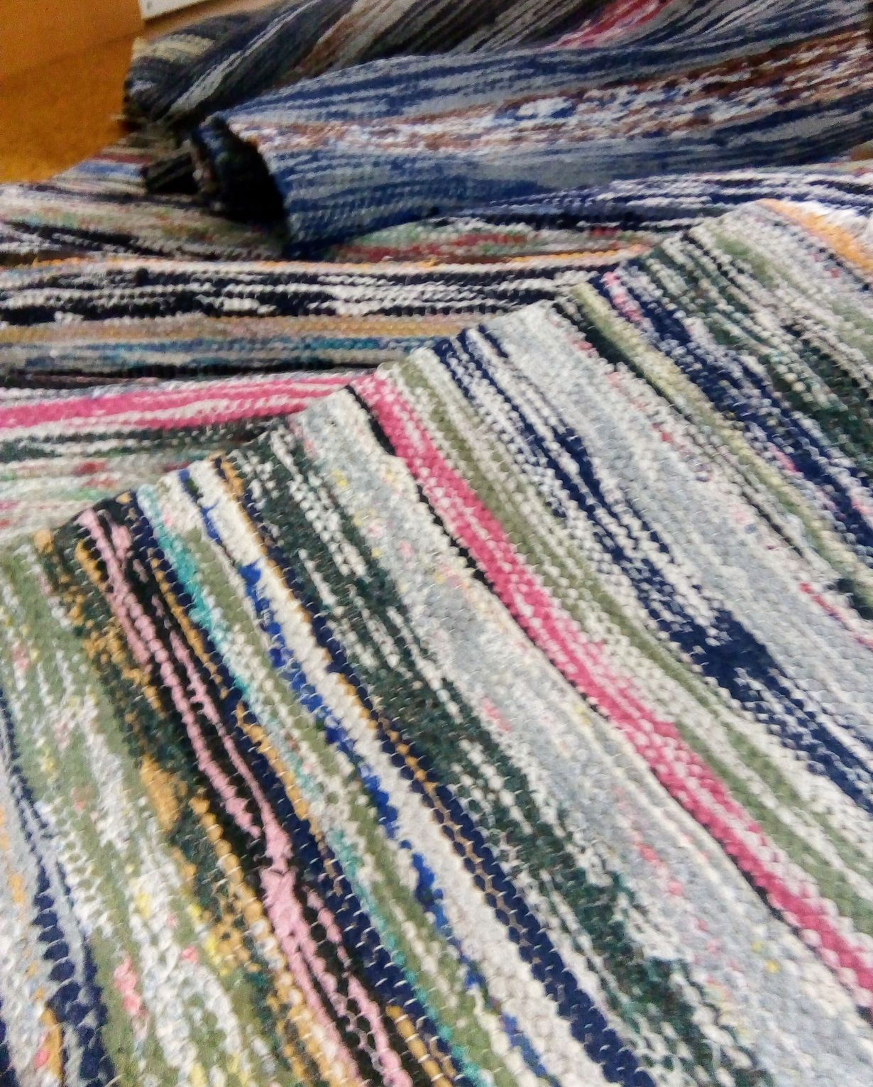 Äidin joskus 1960-luvulla kutomia räsymattoja menossa pihalle tuulettumaan. Raidoissa voin nähdä omia lapsuudesta tuttuja kuoseja, vanhat vaatteet leikattiin matonkuteiksi ja kiedottiin isoiksi keriksi, joita säilytettiin vintillä. Talviaikaan kangaspuut seisoivat tuvassa ja äiti kutoi kirjavia mattoja ja joskus ryijyjäkin.