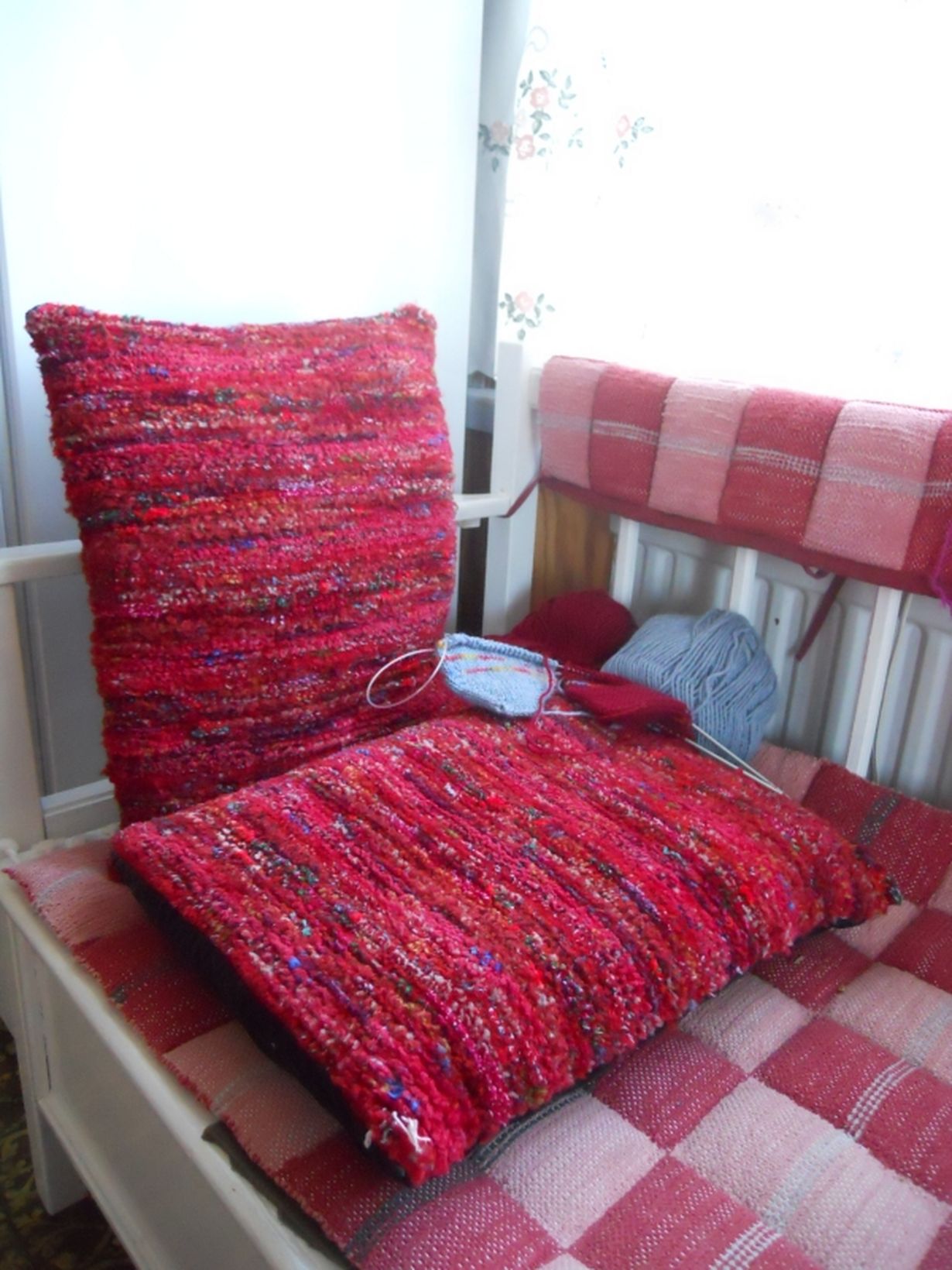 Tässä viihdyn erittäin hyvin, kun käsityö on mukana kuvioissa. Paikka on tupakeittiön puinen pinnasohva. Villainen tyyny on alla ja selän takana. Jalat nostan sohvalle. Ikkunasta vasemmalta tulee valo, joten se on mitä parhain paikka tehdä käsitöitä ja katsoa televisiota, joka on sohvan toisessa päässä olevalla pöydällä. Iltoja varten on spottilamppu kiinnitetty ikkunan välipuuhun. Televisiota en katso juuri koskaan ilman käsityötä.Ikkunasta näkyy pihalletulijat, joita voi sitten mennä vastaanottamaan. Paras paikka kodissani!