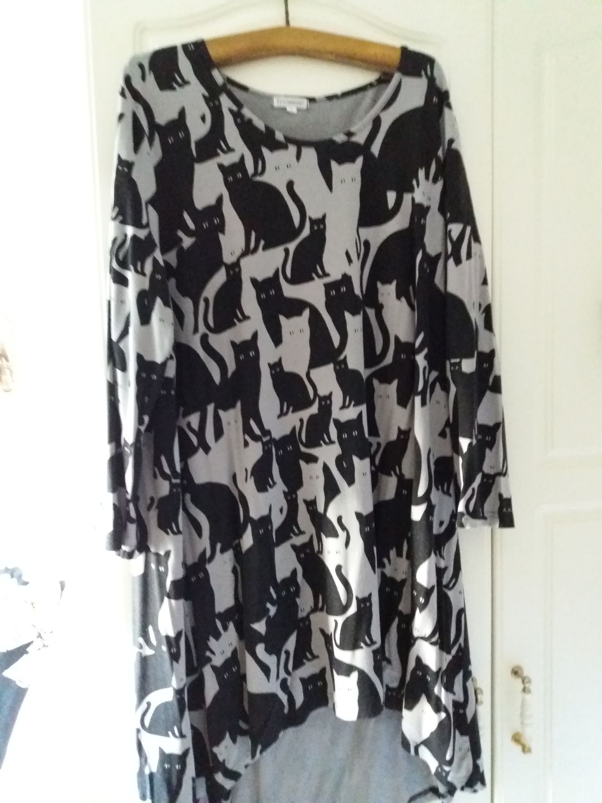 Kissatunika löytyi vuosia sitten edullisesti ns. halpamyymälästä. Oli ihan pakko ostaa se, kissaihminen kun olen. Paita saa usein myönteisiä kommentteja aivan tuntemattomiltakin.