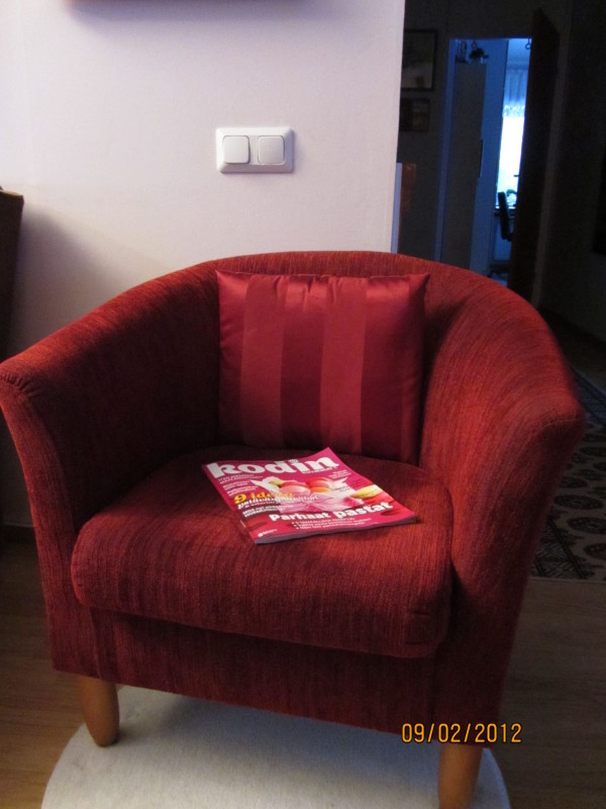 Löysin tämän punaisen pienen nojatuolin muutama vuosi sitten Askon myymälästä ja ihastuin heti, sillä olen lyhytjalkainen mummo, enkä tykkää mistään laiskanlinnasta tai TV-tuolista ja lisäksi tuolini oli kohtuuhintainen!