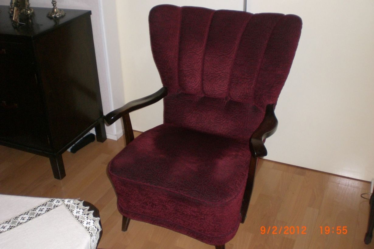 Appivanhempien 1950-luvulla ostama tuoli. Verhoiltukin jo kaksi kertaa. Tukeva, hyvä istua ja katsella telkkua.
