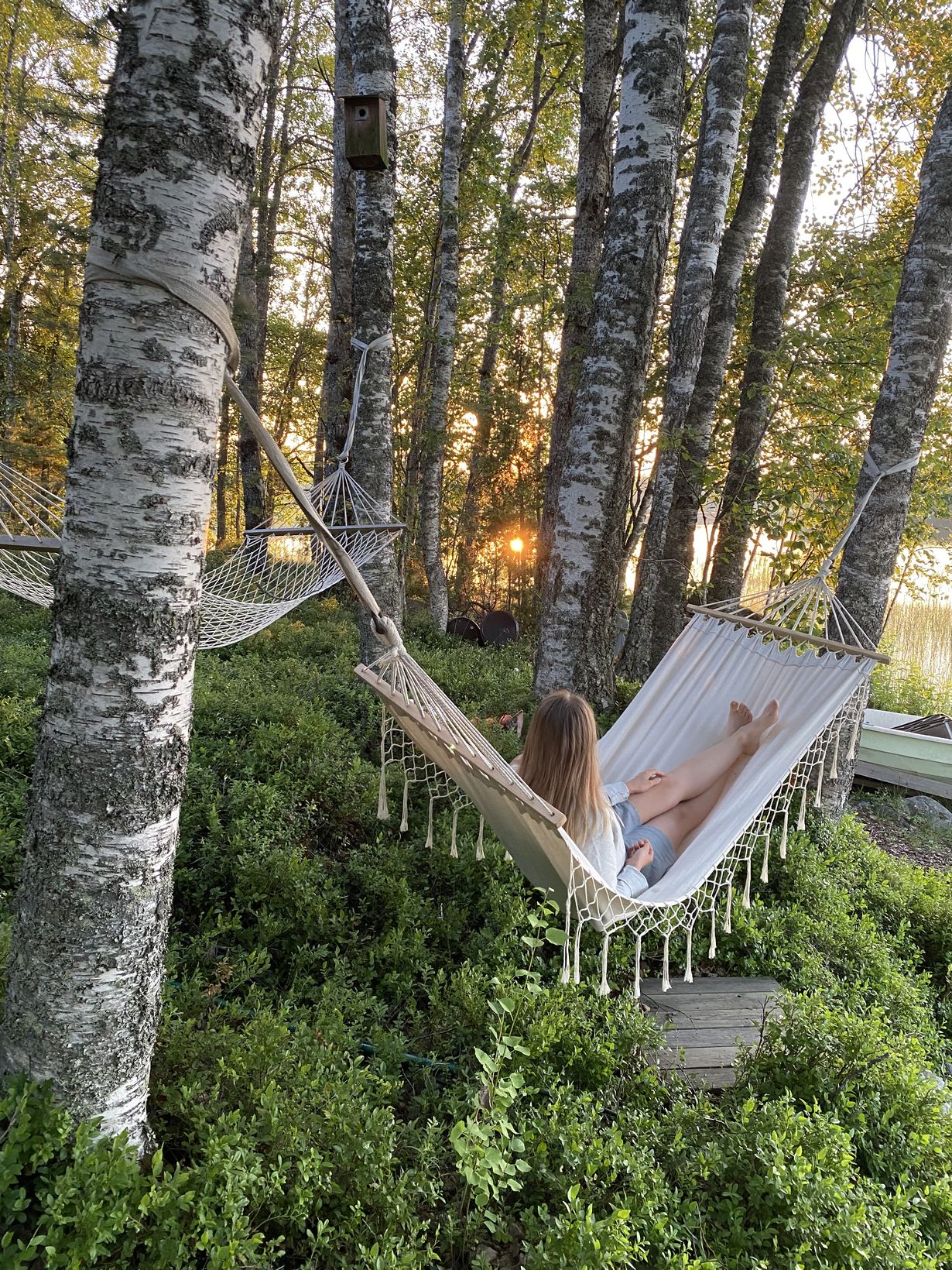 Kesän lempparipaikka löytyy Pertunmaalta, jossa kaksi riippukeinua on asetettu mökkirantaan vierekkäin. Rentoumista parhaimmillaan!