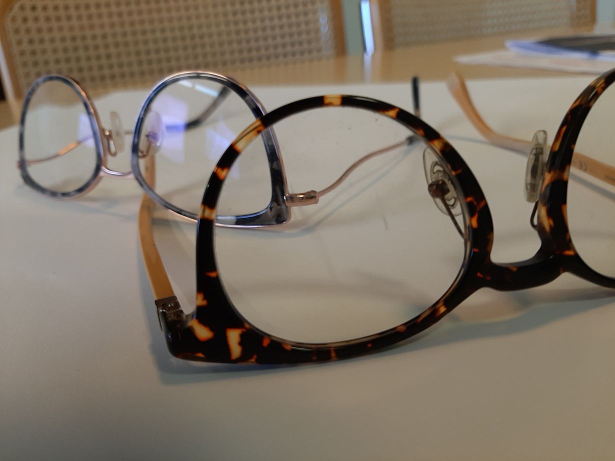 Otin pohjakosketuksen työpaikan tiililattiaan ennen joulua ja ruskeasankaisten lempparilasien vasen linssi naarmuttui. Piti vaihtaa uusiin ja otin takana olevat kissansilmäiset. Ehkä tykästyn niihinkin joskus...