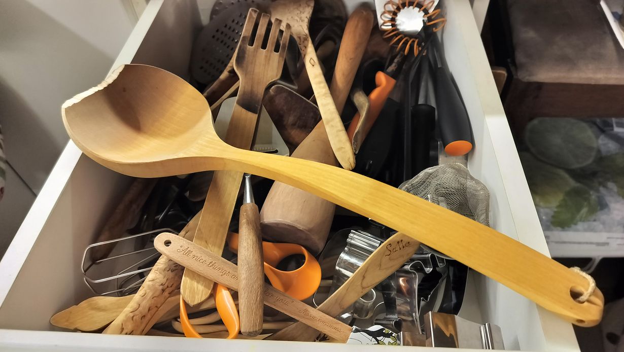 Hmmmm. ... Se oli talon paras ja isoin puinen, käsityönä tehty soppakauha... Oli... Kunnes paloi pinna, ja hakkasin keittiölaatikkoa kiinni-auki-kiinni-auki niin, että kauhaparka jäi väliin ja lastunpalat lensivät 😂 Jotta notta "Levan polkka" vaan soimaan, kun tuima ja tuittupää tuliluontoinen tyttö tässä laulaa legendaarisen Levan polkan tahtiin vaan, että: "Sen minä sanon jotta purra pittää. Ei mua niin voan nielasta"!