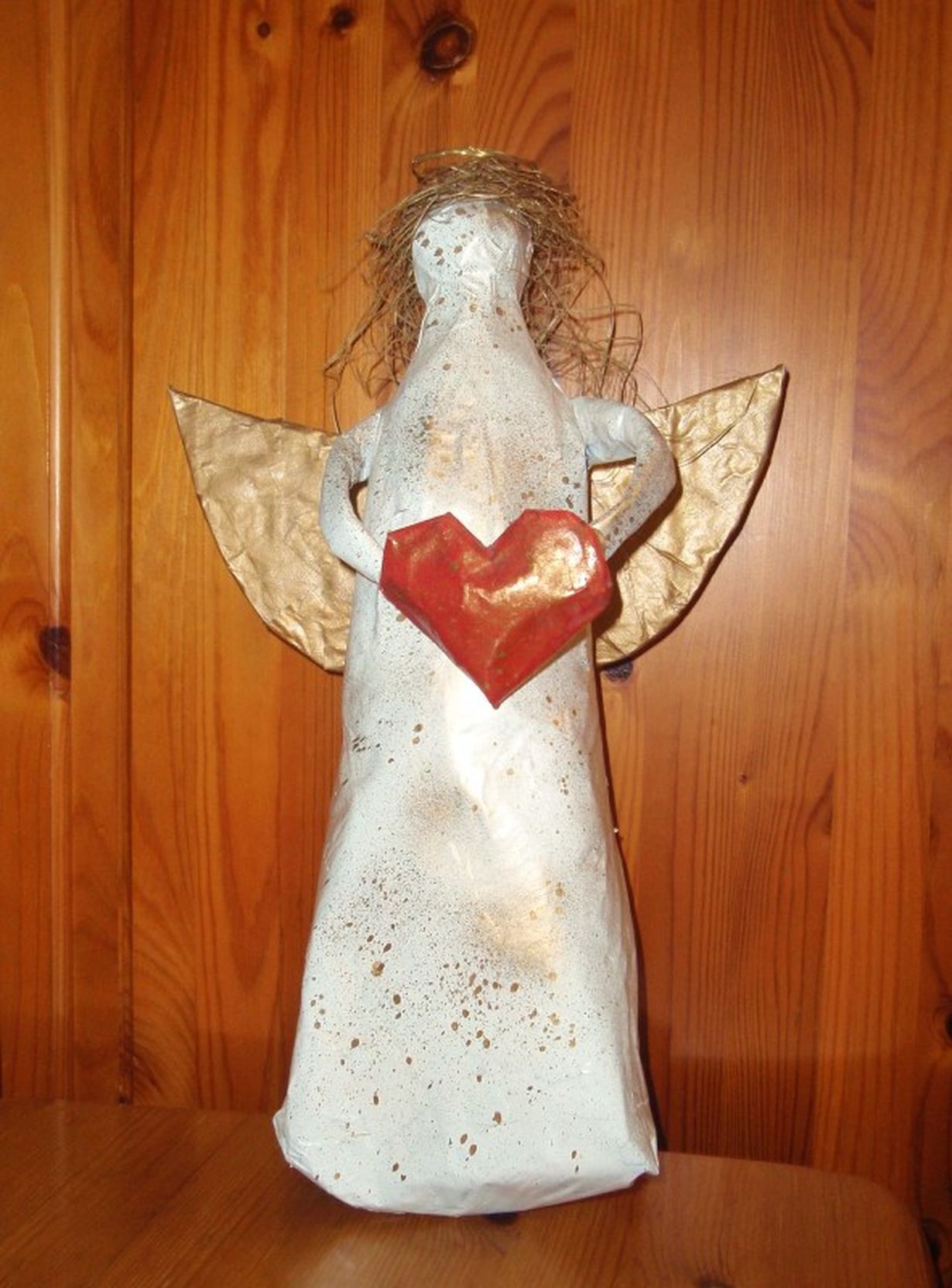 Enkeli on omatekoinen. Runkona on suuri limsapullo, jonka päälle on liisteröity sanomalehteä mekoksi. Siivet on valmistettu pahvista, samoin sydän. Hiukset ovat meriheinää. Enkeli on spreijattu ja siihen on lisätty kultaräiskeitä. Enkeleitä on kolme ja joka joulu ne vartioivat keittiötä leivinuuunin päältä.