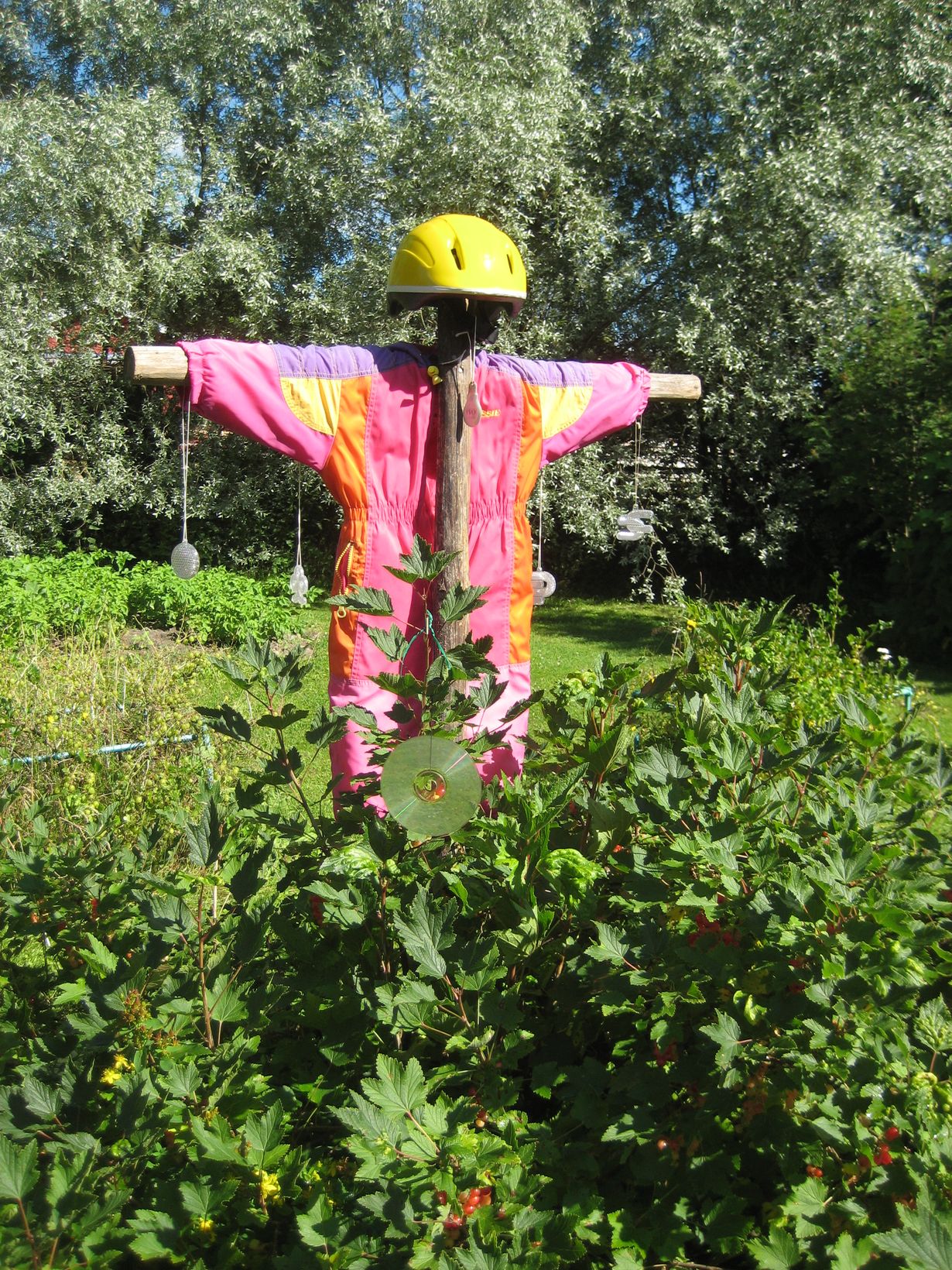 Lähdin vintiltä etsimään tarvikkeita linnunpelätintä varten. Sieltä löytyi tyttäreni vanhat kuluneet haalarit sekä pieneksi jäänyt ja kolhujakin kokenut pyöräilykypärä. Lisäksi ripustettiin heijastimia roikkumaan, ne heijastavat säteitä auringonvalossa ja "kilisevät" tuulessa.