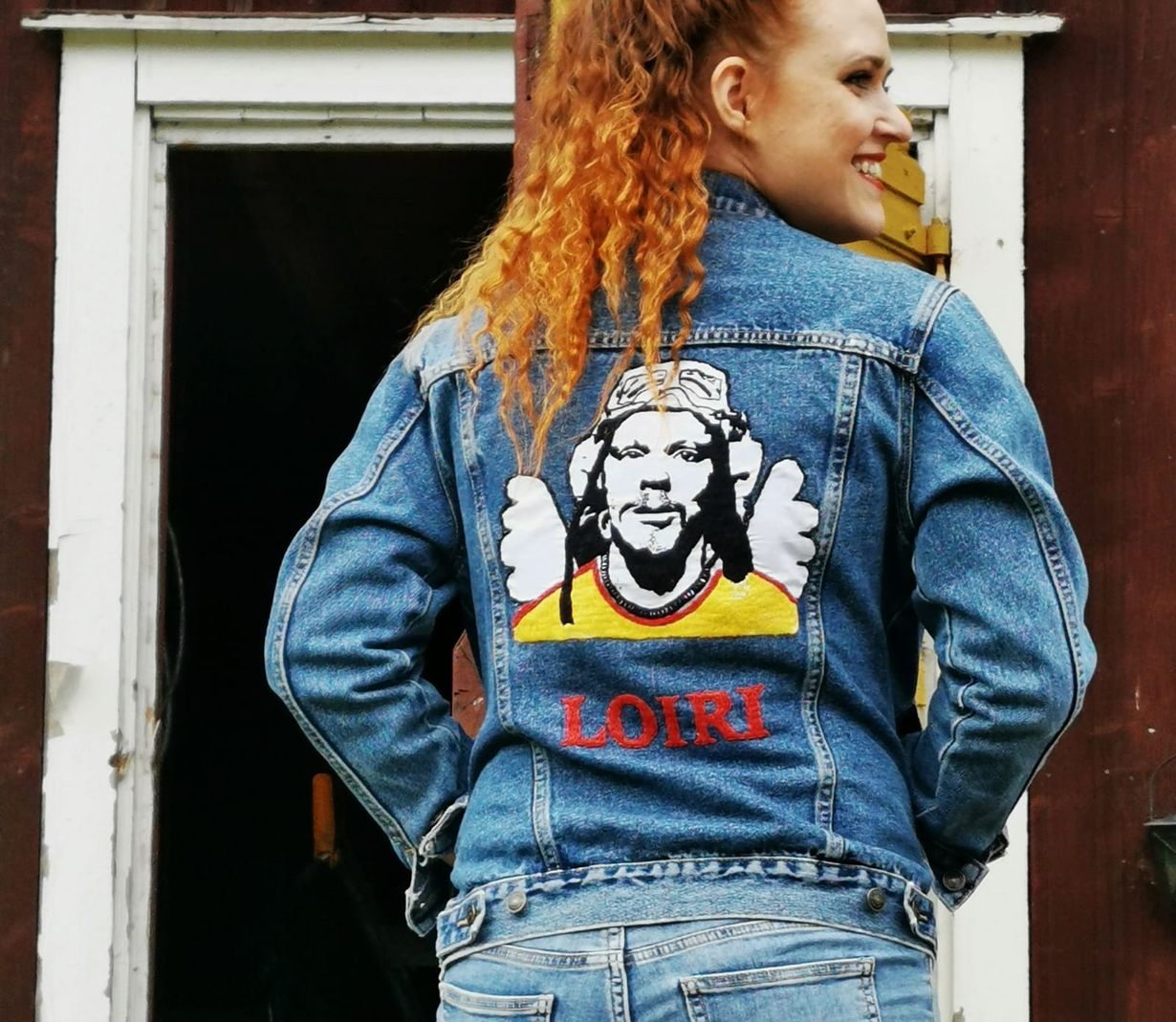 Aloitin keväällä kirjailuharrastuksen ja pikkusisko toivoi syntymäpäivälahjaksi käsinkirjailtua Vesa-Matti Loiri teemasta farkkutakkia. Tältä se näytti valmiina.