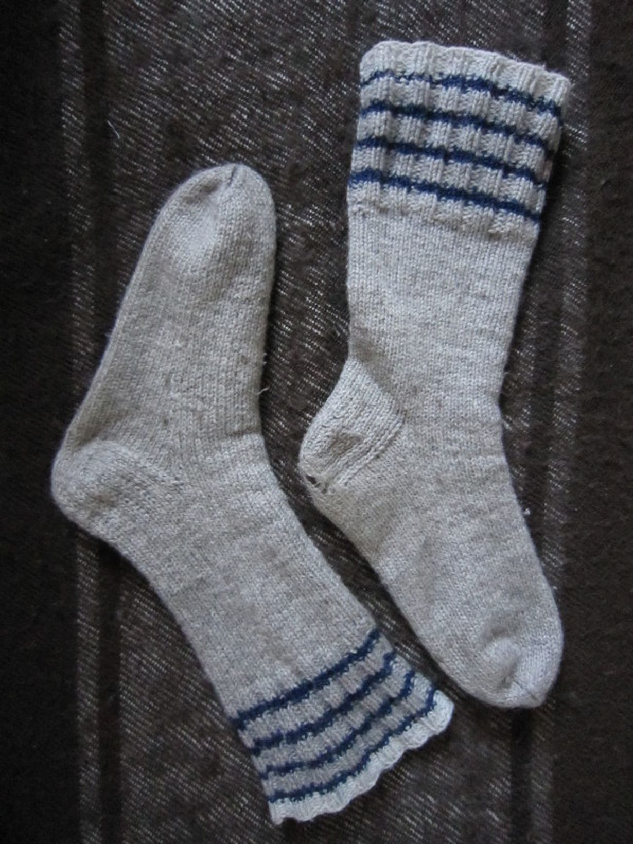 Luultavasti edesmenneen isäni vanhat sukat, jotka löysin kotitaloni komeron pohjalta. Aivan ihanat käyttää lomamatkoilla matkailuautolla sisätossujen sijasta. Kesäkuumallakin kärsin kylmyydestä varpaissa ja vedosta pohkeissa, mutta nämä pitkävartiset sukat ylettyvätkin melkein polviin saakka. Ja ovat luultavasti kokoa 45, eli aivan sopivan väljät minun 40 numeroiseen jalkaani. Olenpa sattunut joskus toisten iloksi loikkaamaan autosta sortseissa ja villasukissani autoa tankkaamaan.