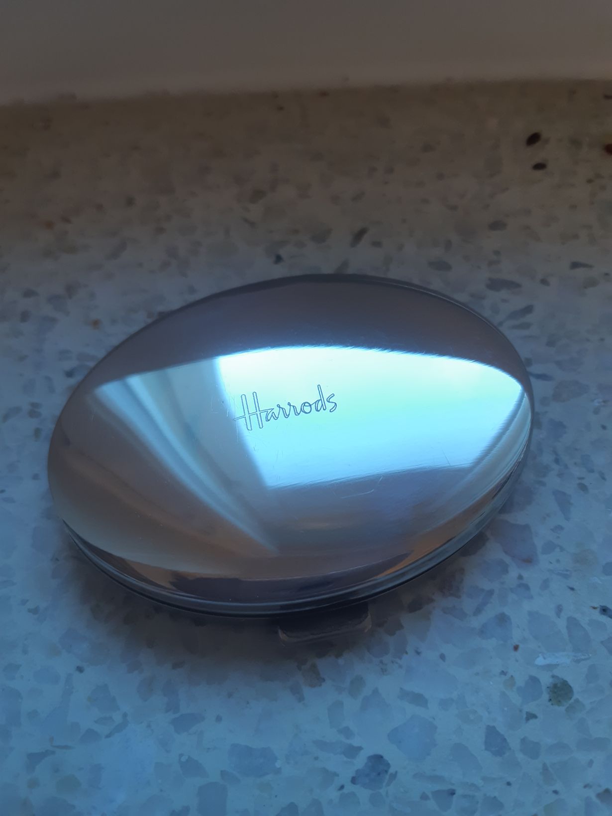 Olimme entisen työnantajan myyntikokousmatkalla Lontoossa 1997. Kaikki naiset saivat tyylikkään pienen peilin. Kannessa lukee "Harrods", eli luxus-tavaratalosta. Tämä peili on vain paremmissa menoissa mukana.
