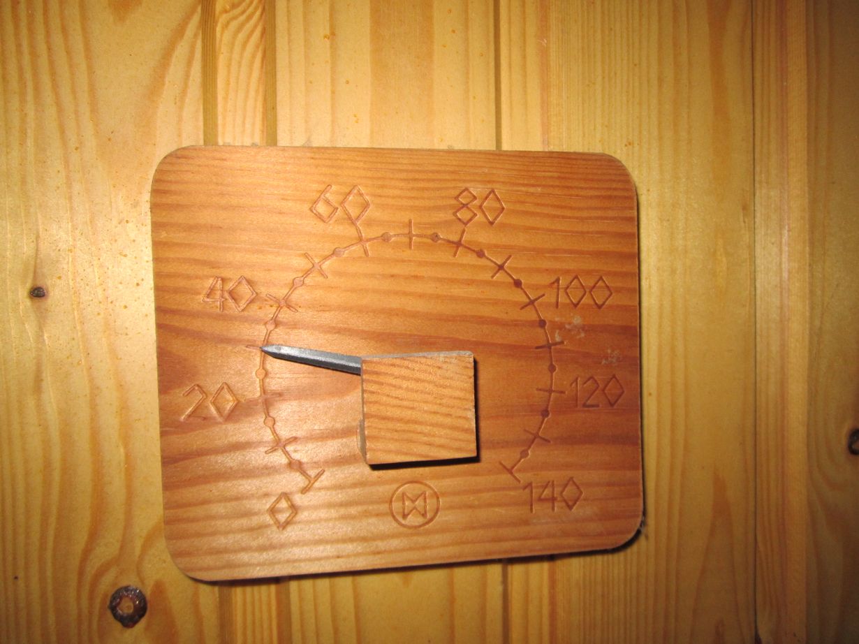 Mittari oli valmiina,kun ostimme talon,se oli ollut toistakymmentä vuotta asuttuna.Mittari näyttää,että puusaunasssamme on välillä liiankin kuumaa!