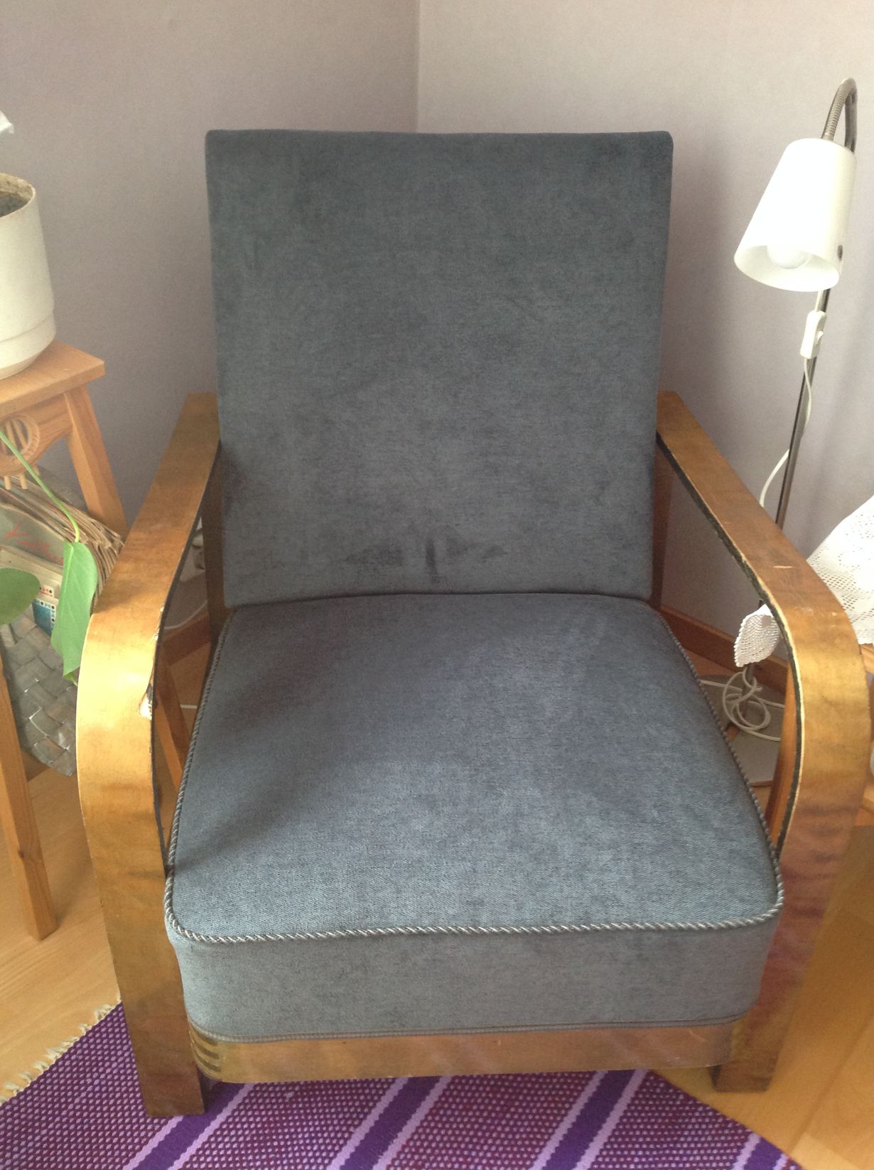 Sain tämän tuolin kierrätysringistä. Vaihdatutin siihen nuorten työpajassa fyllingit ja verhoilun. Siitä tuli aivan ihana lukutuoli! samalla pystyin tukemaan syrjäytymisvaarassa olevia nuoria edes himpun verran.